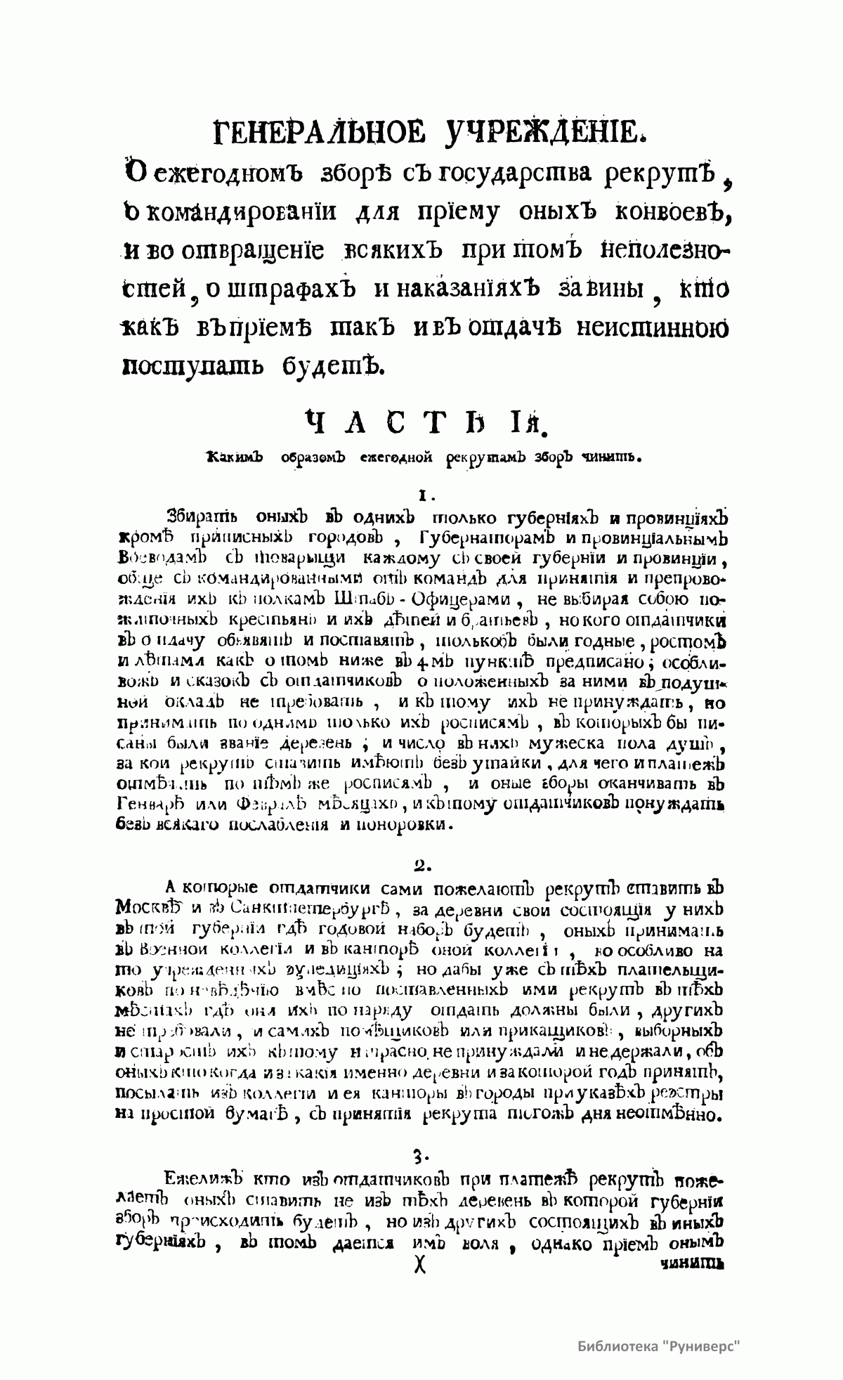 Генеральное учрежденiе. О ежегодномъ зборѣ съ государства рекрутъ, о командированiи для прiема оныхъ конвоевъ, и во отвращенiе всякихъ при томъ неполезностей, о штрафахъ и наказанiяхъ за вины, кто какъ въ приемѣ такъ и въ отдачѣ неистинною поступать будетѣ