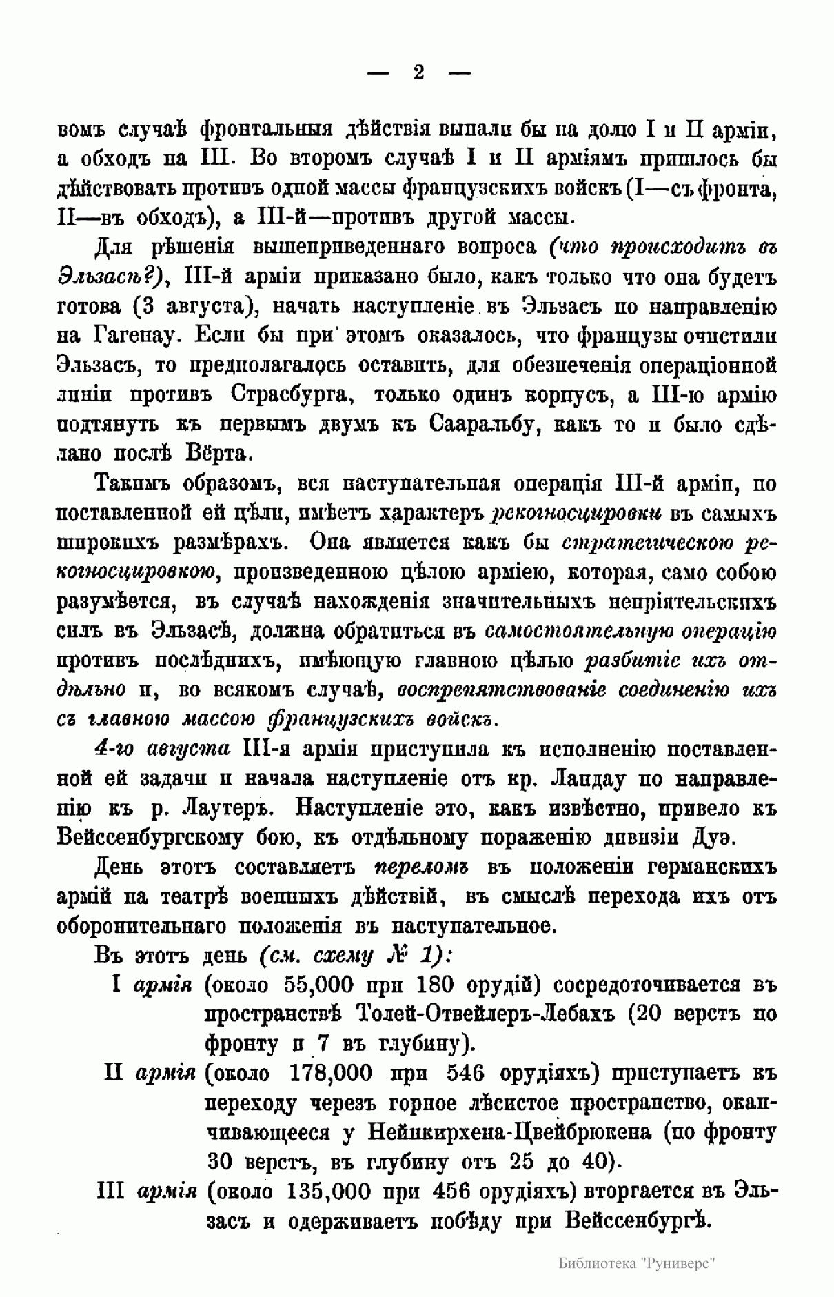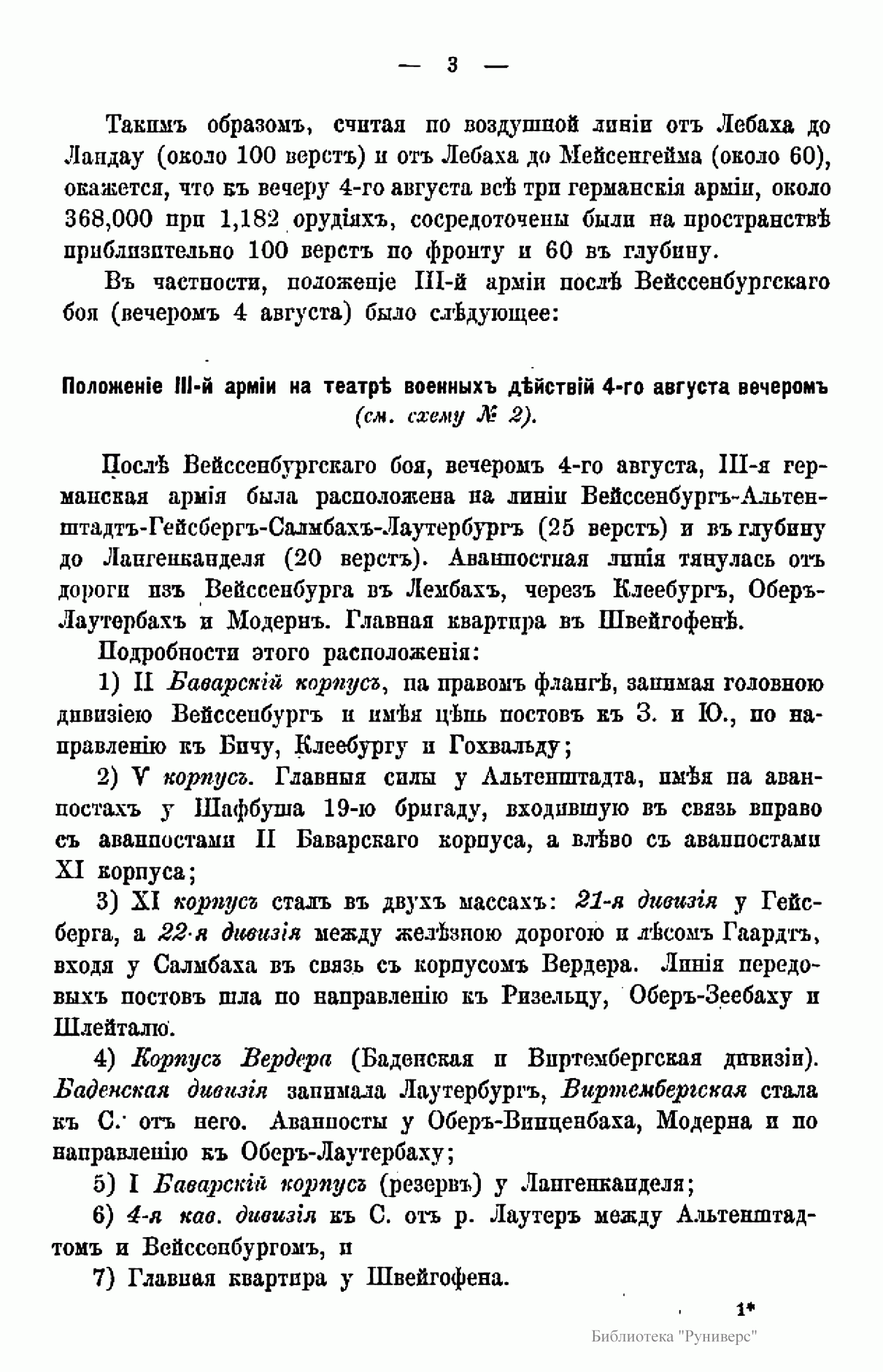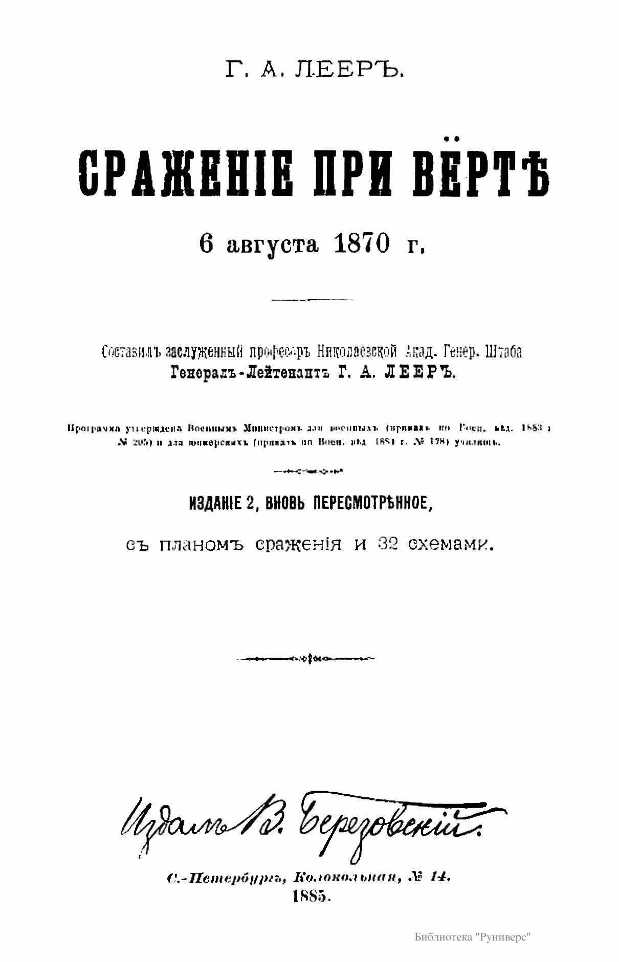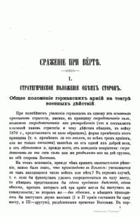 Издание посвящено сражению при Вёрте, происходившему во время франко-прусской войны 1870 – 1871 гг. Франко-прусская война 1870 – 1871 гг. – война между Францией, стремившейся сохранить свою гегемонию в Европе и препятствовавшей объединению Германии, и Пруссией, выступившей совместно с рядом других германских государств. В ходе войны прусские войска оккупировали значительную часть территории Франции, участвовали в подавлении Парижской Коммуны 1871 г. Война завершилась Франкфуртским мирным договором 1871 г., по которому Франция передавала Германии Эльзас и северо-восточную часть Лотарингии, а также обязалась выплатить 5 млрд. франков контрибуции. В итоге франко-прусской войны было завершено объединение Германии под гегемонией Пруссии, во Франции рухнул режим Второй империи и возникла Третья республика. Сражение при Вёрте (городок на реке Зауер) – сражение между французскими войсками под командованием Мак-Магона и прусскими войсками под командованием фон Блюменталя, в котором Мак-Магон потерпел полное поражение. Автор описывает стратегическое положение обеих сторон; поле сражения; два периода сражения и преследование побежденного противника.