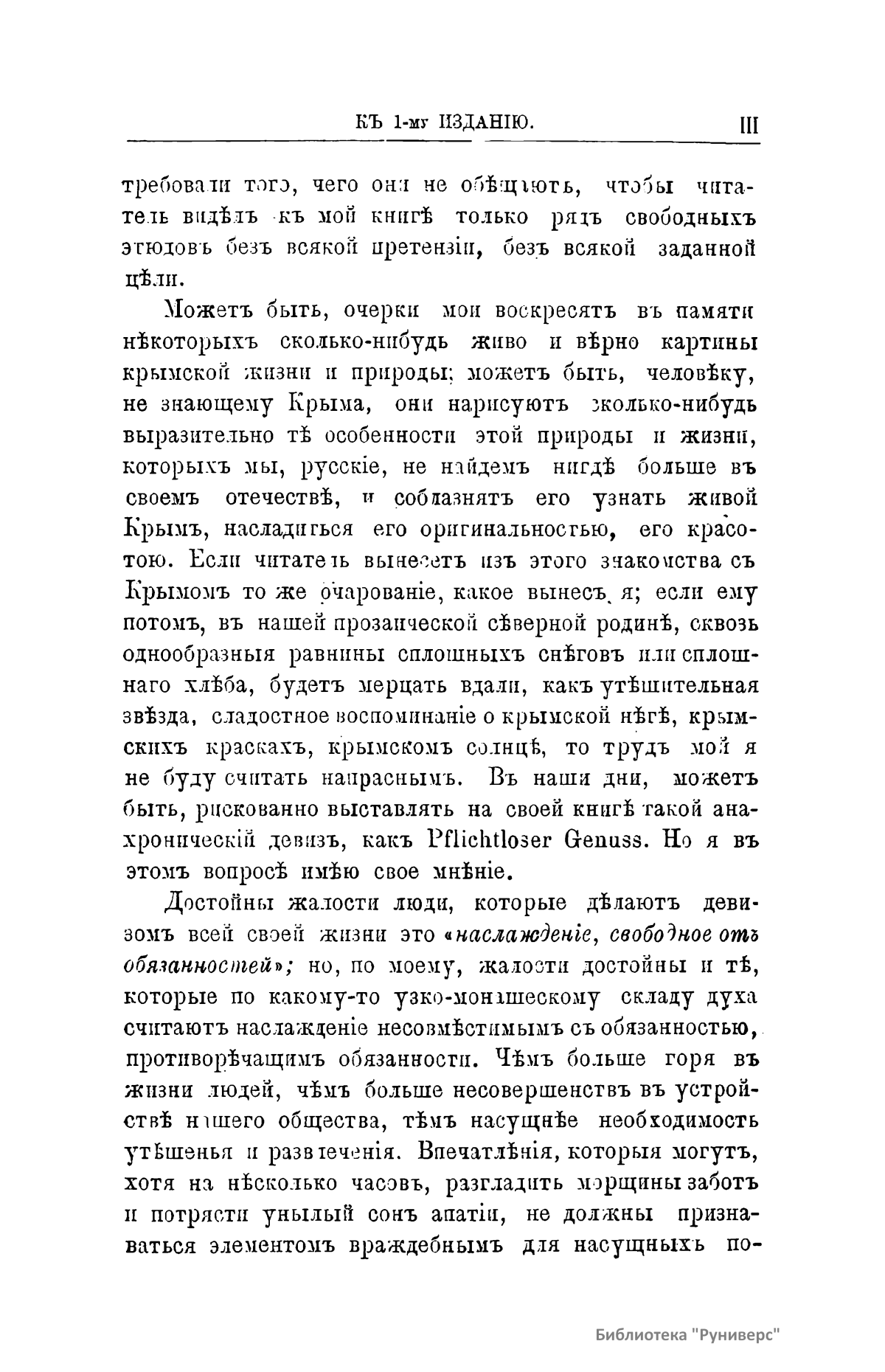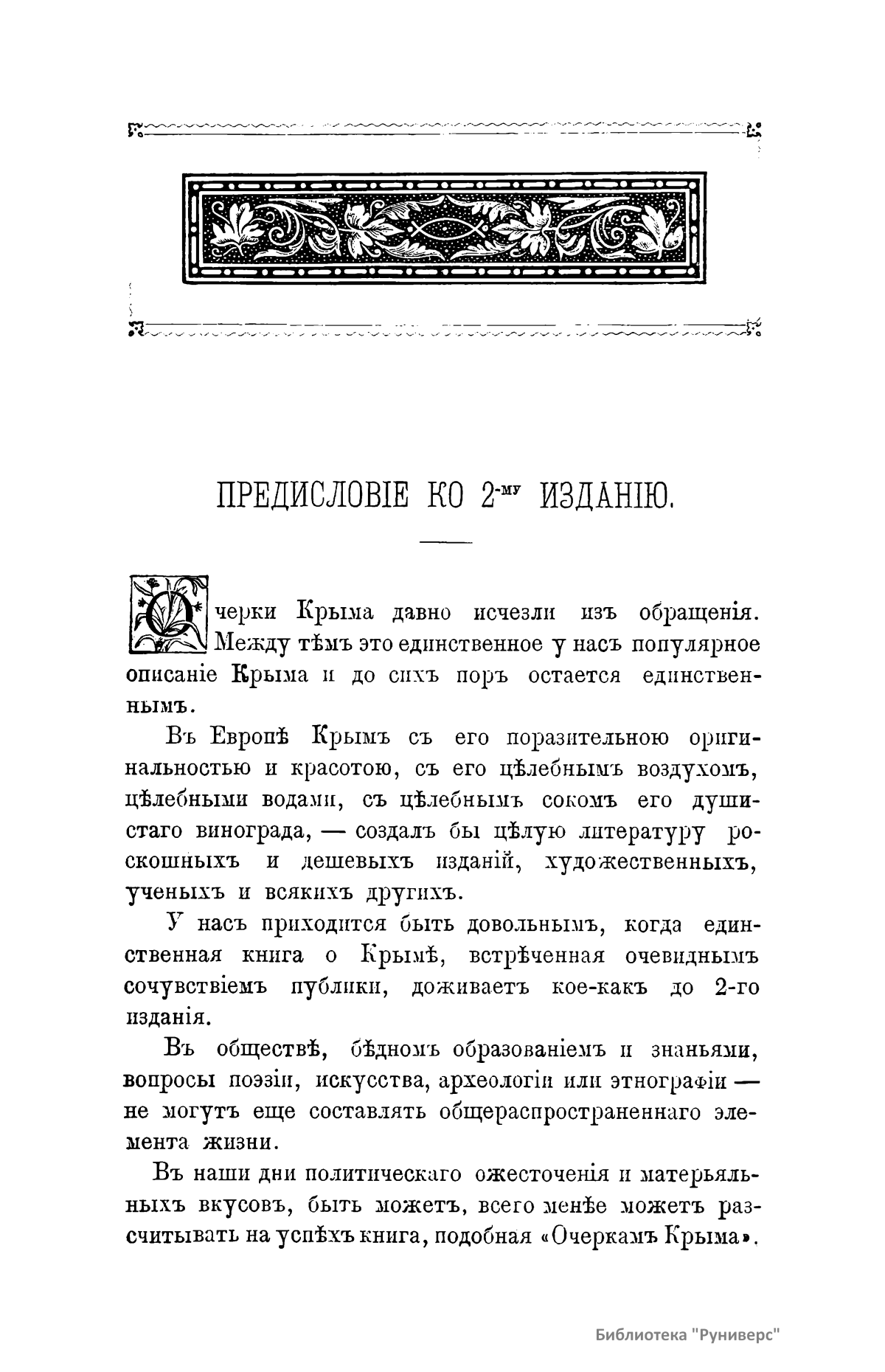 Автор описывает свои впечатления от встречи с новым миром, открывшимся для него в Крыму в 1866 г. Издание представляет собой собрание очерков. Крымские степи, крымское море, крымские горы, легенды и развалины древности, легенды и развалины истории нового времени, Бахчисарай и Севастополь, южный берег и пещерные города – все типичное Крыма нашло свое место на страницах этих очерков. Автор не стесняет себя последовательностью и внешней полнотой описания, он набрасывает в свой путевой альбом все, что поражало его, и признается в том, что лучшие дни его жизни протекли в этом чудесном краю. «Очерки» опубликованы в 1883 г., когда исполнилось сто лет со дня присоединения Крыма к России. Воспоминание об этом важном событии русской государственной истории должно, по мнению автора, побудить русского читателя ознакомиться как можно ближе с прошлым и настоящим этого очаровательного края, который вошел сто лет назад в состав русского царства как его лучшая жемчужина, по счастливому выражению великой императрицы.