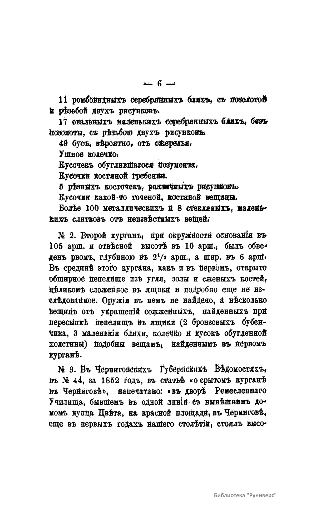 Городища и курганы – памятники жизни северян языческого периода. Автор брошюры полемизирует с Гебгарди, Шлецером, Карамзиным и другими историками, считавшими древних северян полудиким народом. Руководствуясь данными археологических раскопок, он доказывает, что северяне языческого периода – народ значительно цивилизованный, с политическими союзами, политической властью, общими обычаями, народ культурный.