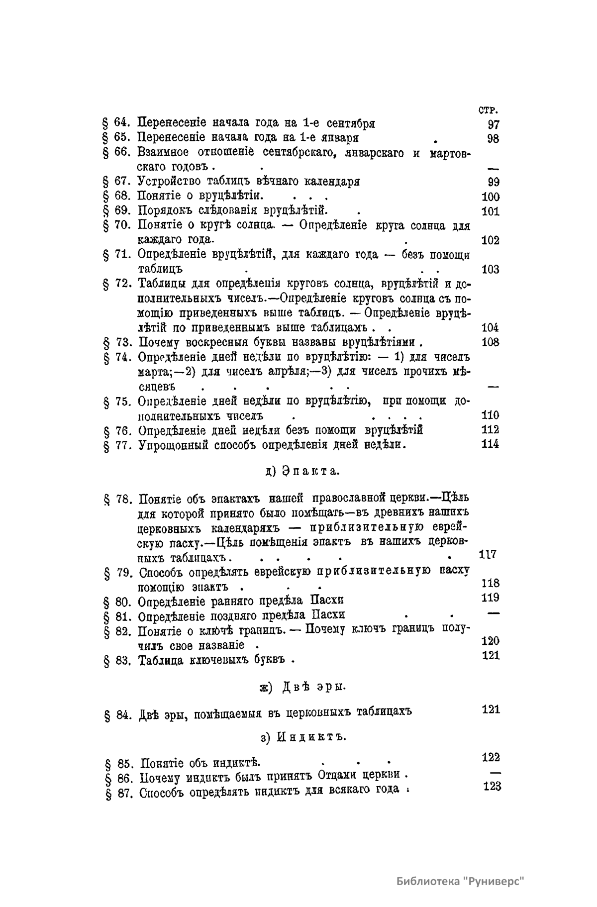 Издание предназначено для тех, кто испытывает потребность в знании правил, на которых основано времясчисление у разных народов. Автор излагает календари народов нехристианских: китайцев, японцев, народов Индокитая, египтян, древних греков, римлян, евреев, магометан; говорит об общих основаниях христианского времясчисления, о времясчислении, принятом Русской православной церковью. Отдельные главы посвящены применению пасхалии к поверке летописей и определению дня Пасхи по правилам Григорианского счисления.