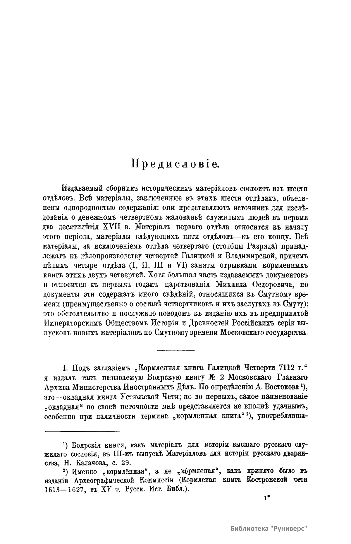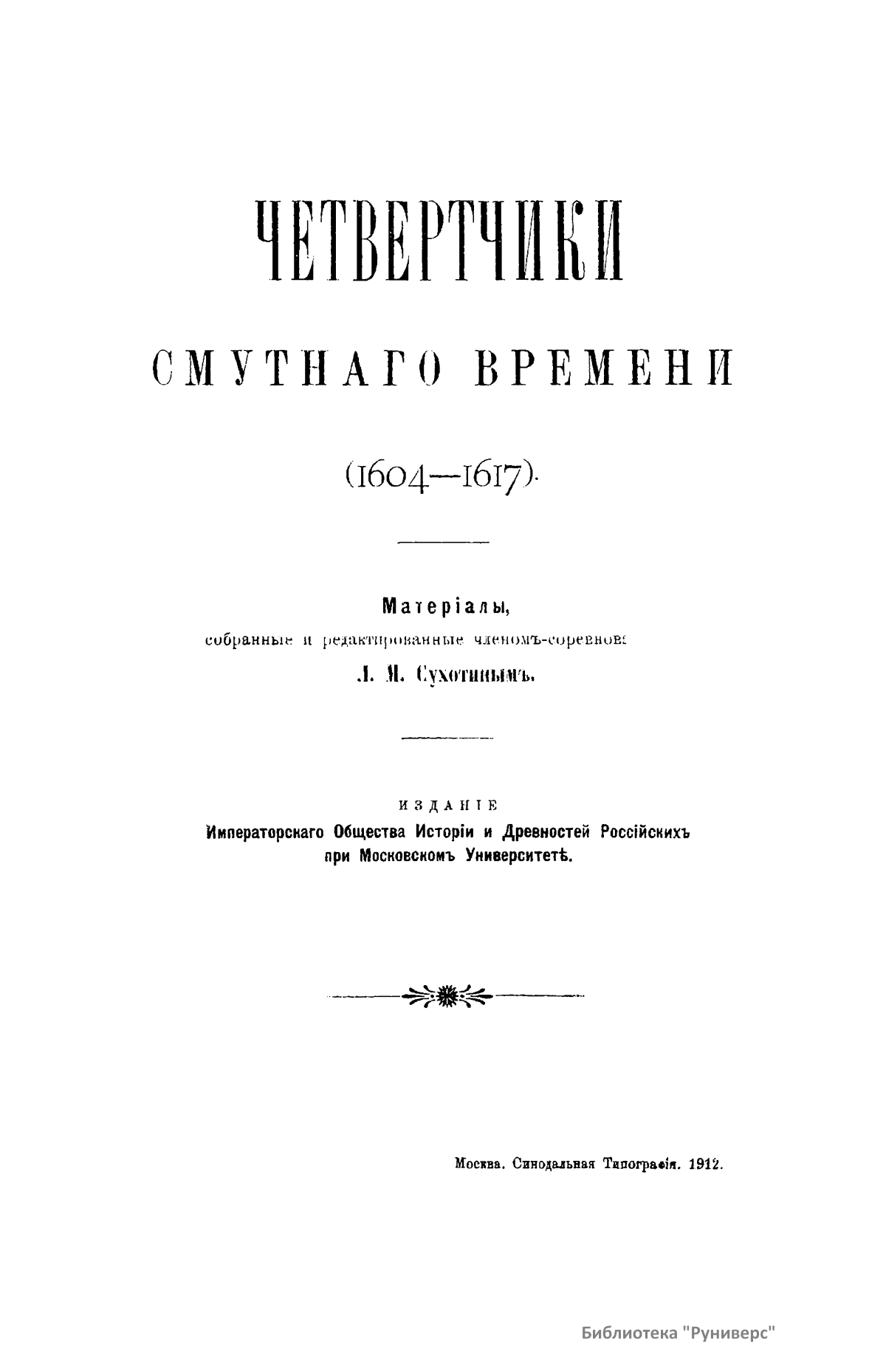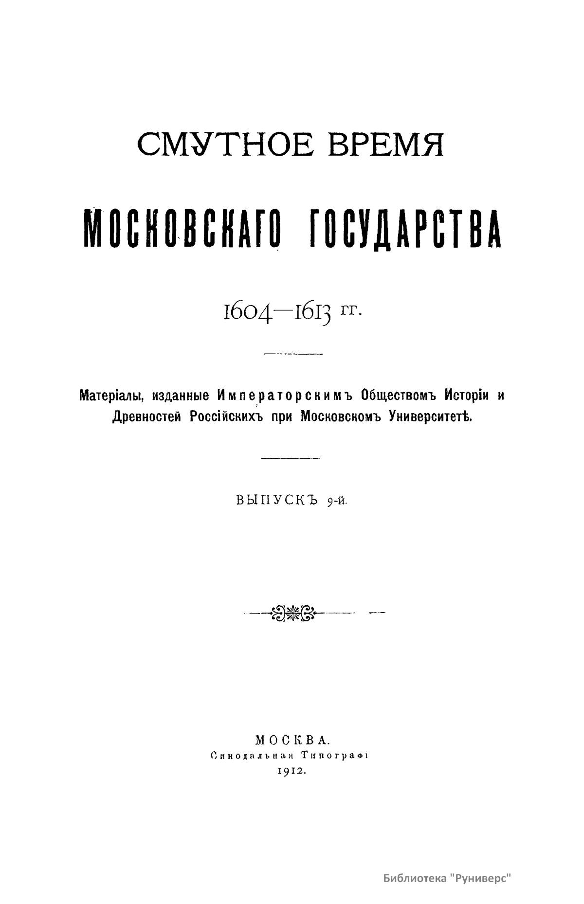 Третий выпуск материалов, изданных Императорским обществом истории и древностей российских при Московском университете. Включает документы Московского главного архива министерства иностранных дел, относящиеся ко времени междуцарствия, а также несколько позднейших дел о Ф. Андронове, в которых можно найти ряд ценных указаний о событиях Смутного времени. Перечень опубликованных Актов Московского государства и Актов Польского государства находится в конце издания. В четвертом выпуске опубликованы Арзамасские поместные акты 1578 – 1618 гг. По ним можно проследить, как вотчинное землевладение, ничтожное в Арзамасском уезде до Василия Шуйского, значительно возрастает во время Смуты, особенно во время правления бояр соединенного ополчения. Первые годы царствования Михаила Федоровича представляют в истории служилого землевладения не меньший интерес. Для государства это время ликвидации Смуты и путаницы, внесенной в землевладение, а для служилых людей это время упрочения за собой захваченных правдами и неправдами во время распада государственной власти выгод. В пятом выпуске опубликованы акты подмосковных ополчений и земского собора 1611 – 1613 гг. Девятый посвящен четвертчикам Смутного времени 1604 – 1617 гг. Опубликованные материалы представляют источник для исследования о денежном четвертном жалованье служилых людей в первые два десятилетия семнадцатого века.
