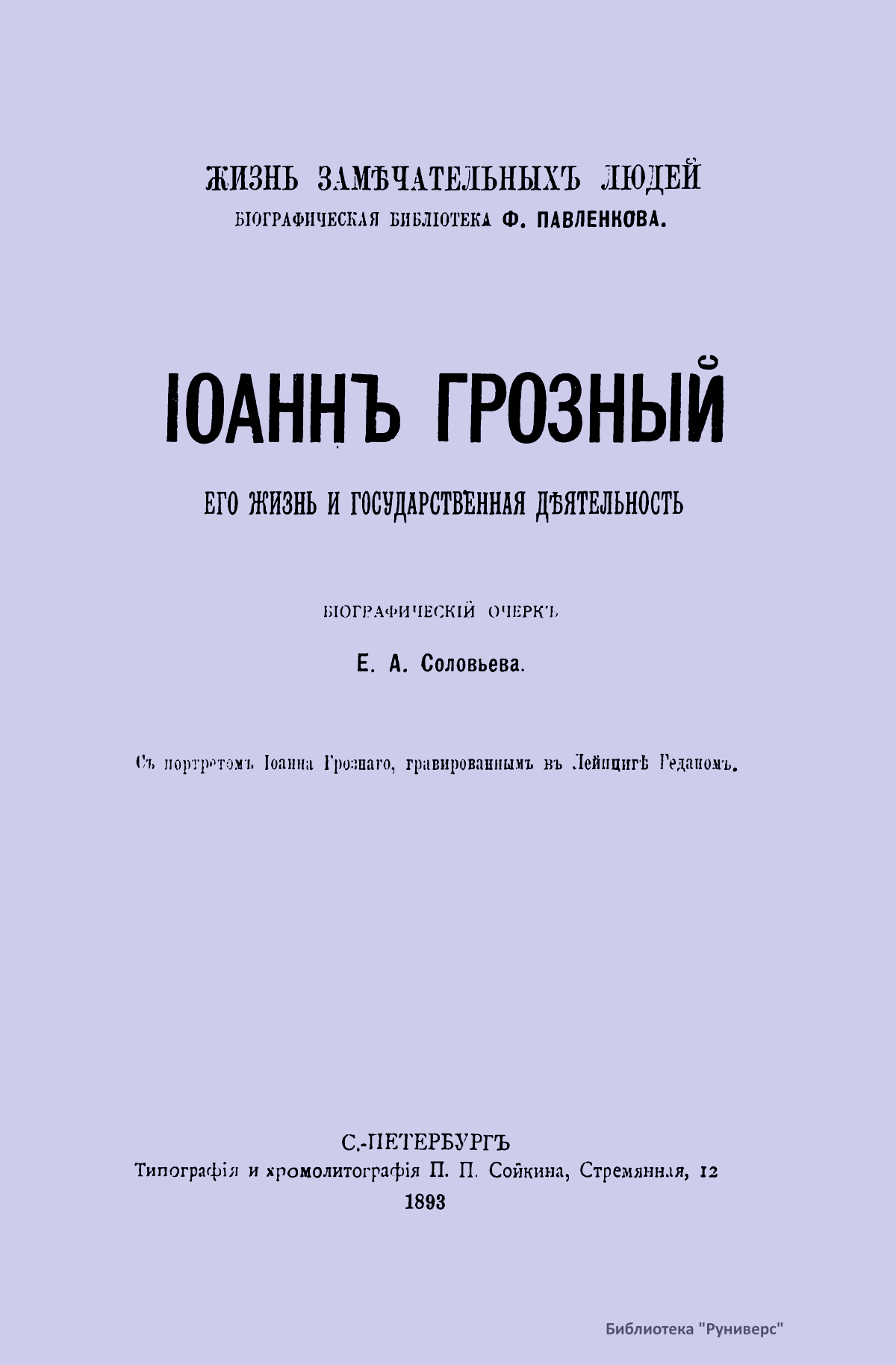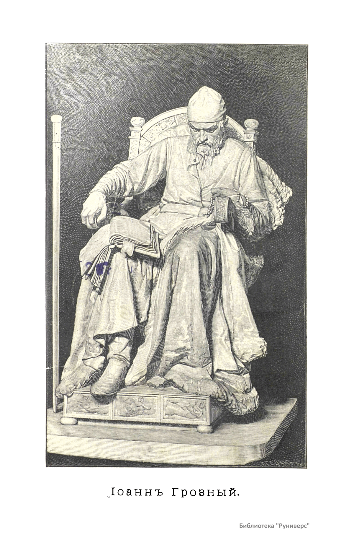 Биографический очерк из серии «Жизнь замечательных людей» с портретом Ивана Грозного, гравированным в Лейпциге Геданом. Иван IV Васильевич Грозный (1530 – 1584), великий князь Московский и всея Руси (с 1533 г.), первый русский царь (с 1547 г.), сын Василия III. С конца 40-х гг. правил с участием Избранной рады. При нем начался созыв Земских соборов, составлен судебник 1550 г. Провел реформы управления и суда (Губная, Земская и др. реформы). Покорил Казанское (1552) и Астраханское (1556) ханства. В 1565 г. ввел опричнину. Вел Ливонскую войну (1558 – 1583). При Иване IV установились торговые связи с Англией (1553), создана 1-я типография в Москве. Началось присоединение Сибири (1581). Внутренняя политика Ивана IV сопровождалась массовыми репрессиями.