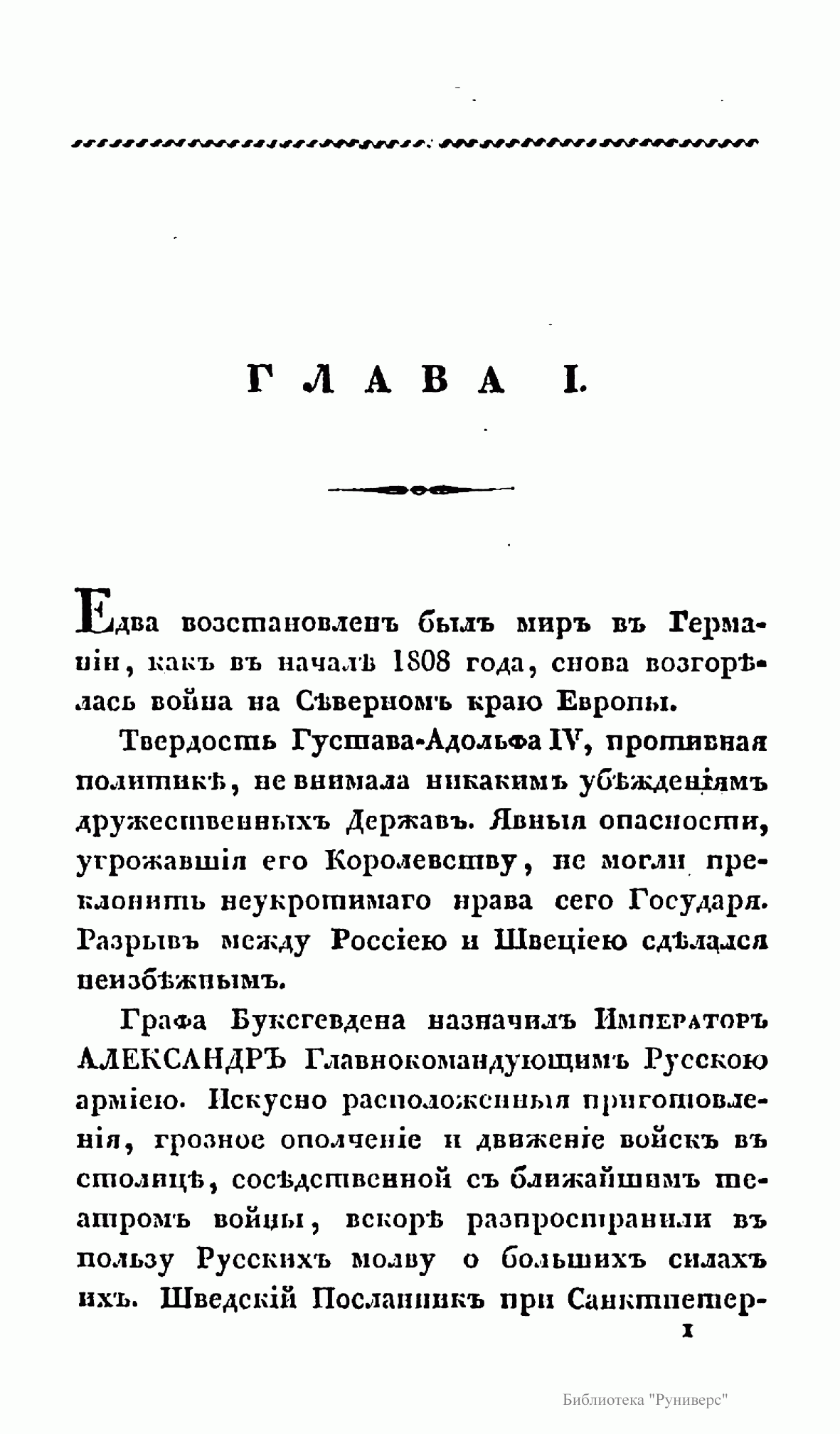 Русско-шведская война 1808-1809 гг. вызвана стремлением России в условиях начавшейся в 1807 г. войны с Великобританией установить полный контроль над финским и Ботническим заливом в целях обеспечения безопасности Петербурга. Тильзитский мир 1807 г. поставил Швецию перед дилеммой: присоединиться, как и Россия, к континетальной блокаде и тем самым поставить под удар британского флота свою морскую торговлю и отказаться от английского рынка, либо сохранить традиционный союз с Великобританией и пойти на конфлиут с Россией. Король Густав IV Адольф взял курс на разрыв с Россией, хотя Швеция не была готова к войне. В результате этой войны по Фридрихгамскому мирному договору к России отошла Финляндия. Автор книги «принимает на себя труд заплатить достойную дань воинским доблестям двух наций» и надеется, что «изложение военных событий будет занимательным».