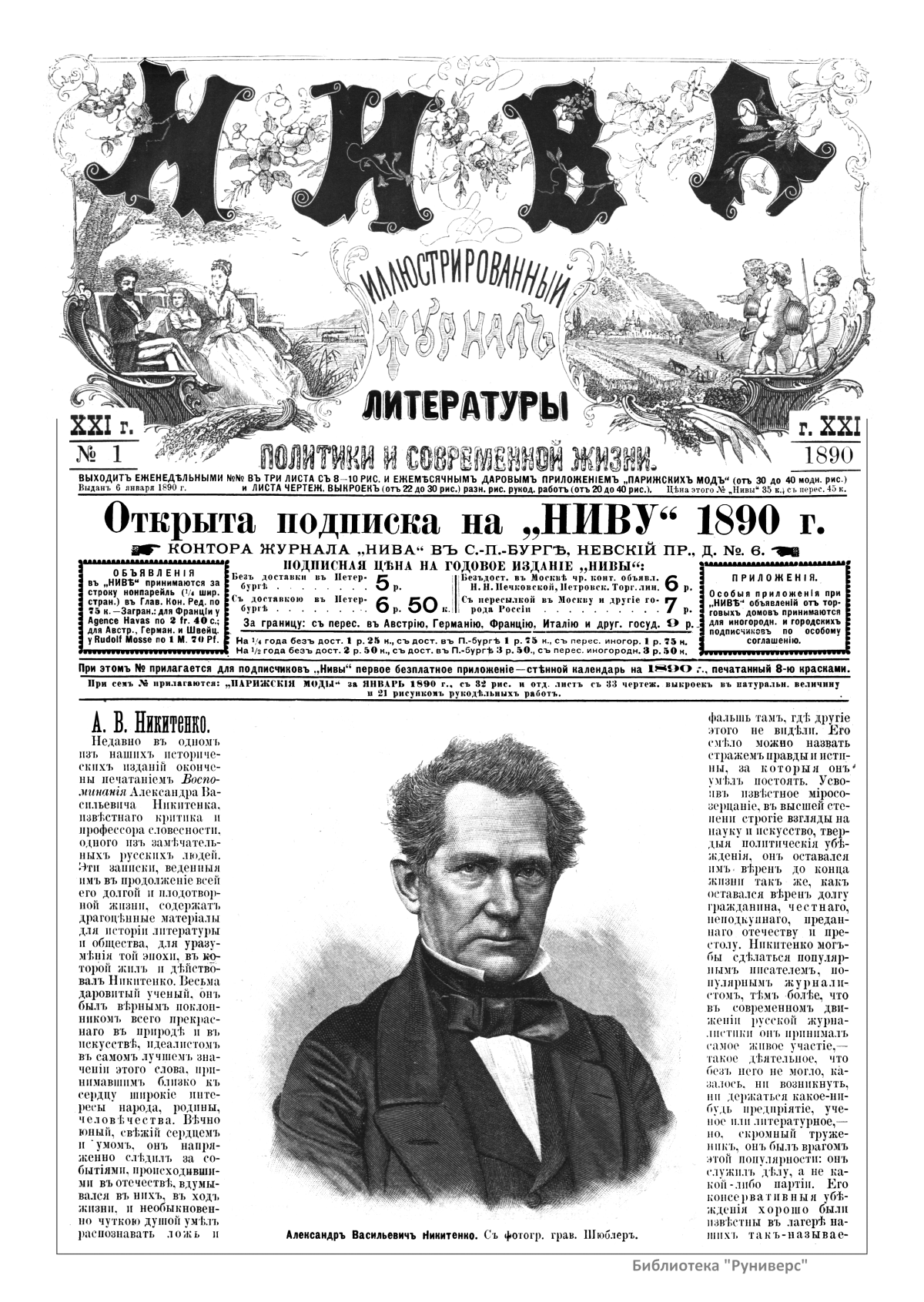 «Нива» — популярный еженедельный русский журнал с приложениями, издававшийся со второй половины XIX до начала XX века, носил подзаголовок «Журнал литературы, политики и современной жизни». Журнал был любимым детищем А. Ф. Маркса, возглавлявшего свое издательство вплоть до своей смерти в 1904 г. Позиционировалась «Нива» как иллюстрированный журнал для семейного чтения и был ориентирован, главным образом, на обывателя. В журнале публиковались литературные произведения, исторические, научно-популярные очерки, репродукции и гравюры картин современных художников. Материалы политического и общественного содержания также сопровождались многочисленными иллюстрациями. Среди известных литераторов, печатавшихся в журнале, были А. К. Толстой, Ф. И. Тютчев, Л. Н. Толстой, А. А. Фет, А. П. Чехов, Максим Горький, Корней Чуковский, Анна Ахматова, Иван Бунин и многие другие. Благодаря «Ниве» сочинения многих современных авторов добрались до самых отдаленных областей России.