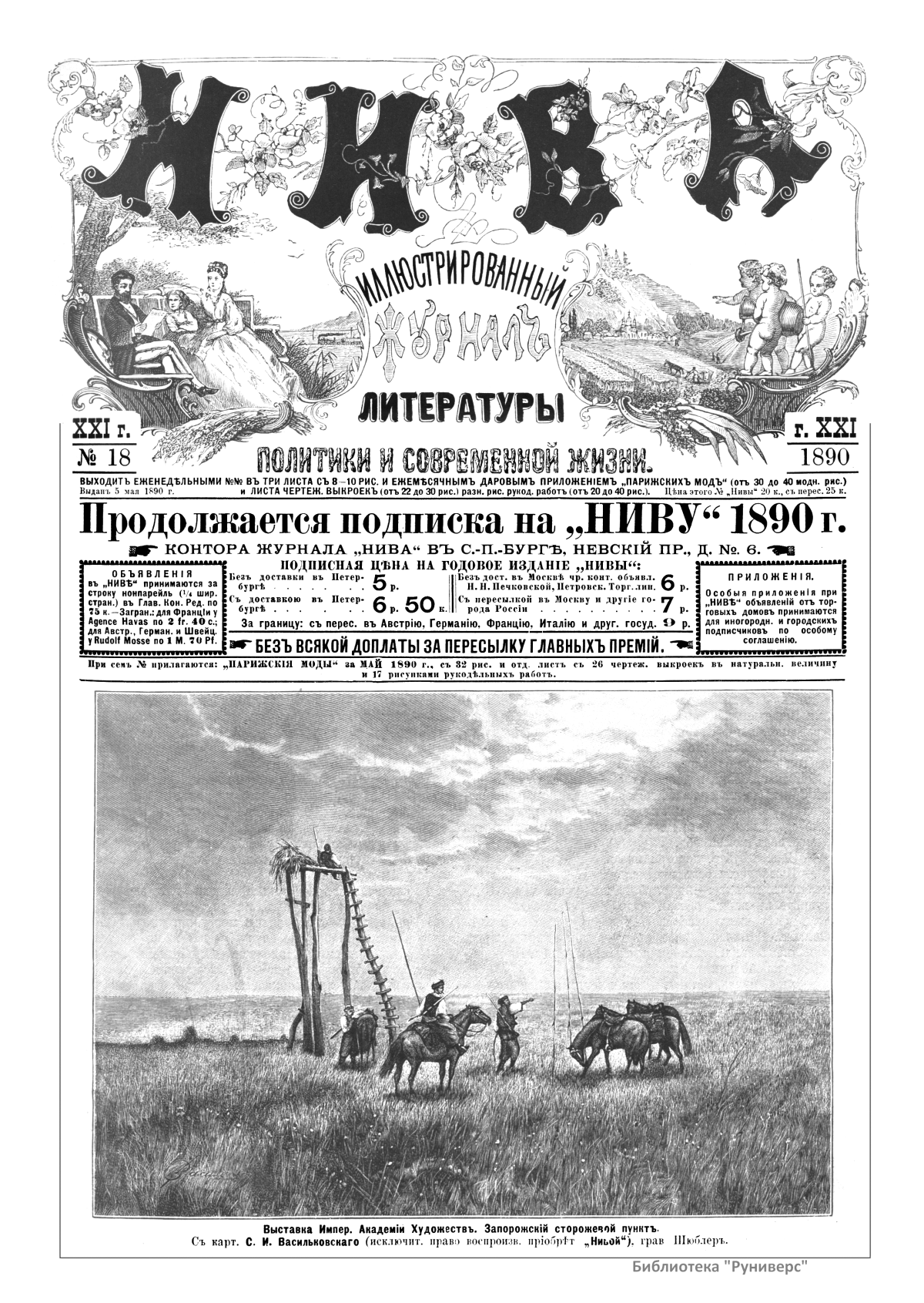 «Нива» — популярный еженедельный русский журнал с приложениями, издававшийся со второй половины XIX до начала XX века, носил подзаголовок «Журнал литературы, политики и современной жизни». Журнал был любимым детищем А. Ф. Маркса, возглавлявшего свое издательство вплоть до своей смерти в 1904 г. Позиционировалась «Нива» как иллюстрированный журнал для семейного чтения и был ориентирован, главным образом, на обывателя. В журнале публиковались литературные произведения, исторические, научно-популярные очерки, репродукции и гравюры картин современных художников. Материалы политического и общественного содержания также сопровождались многочисленными иллюстрациями. Среди известных литераторов, печатавшихся в журнале, были А. К. Толстой, Ф. И. Тютчев, Л. Н. Толстой, А. А. Фет, А. П. Чехов, Максим Горький, Корней Чуковский, Анна Ахматова, Иван Бунин и многие другие. Благодаря «Ниве» сочинения многих современных авторов добрались до самых отдаленных областей России.