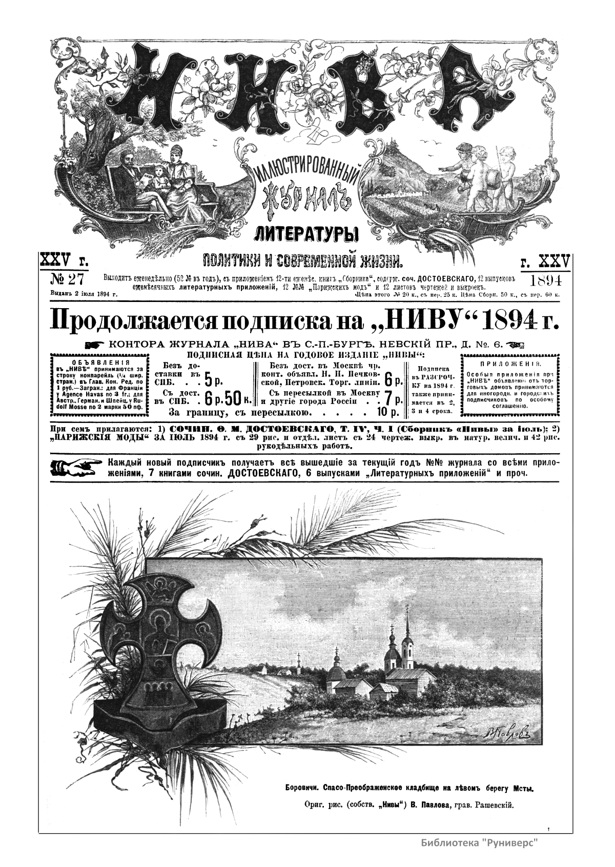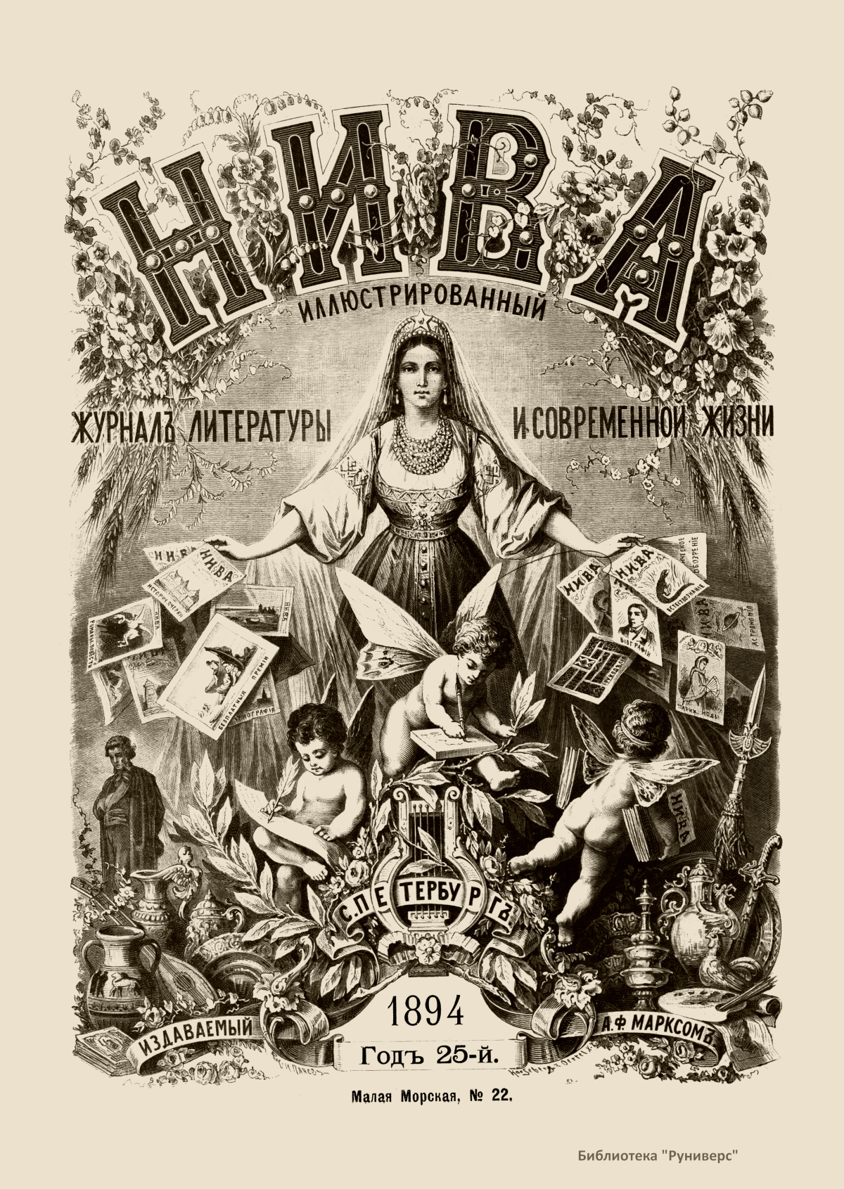 «Нива» — популярный еженедельный русский журнал с приложениями, издававшийся со второй половины XIX до начала XX века, носил подзаголовок «Журнал литературы, политики и современной жизни». Журнал был любимым детищем А. Ф. Маркса, возглавлявшего свое издательство вплоть до своей смерти в 1904 г. Позиционировалась «Нива» как иллюстрированный журнал для семейного чтения и был ориентирован, главным образом, на обывателя. В журнале публиковались литературные произведения, исторические, научно-популярные очерки, репродукции и гравюры картин современных художников. Материалы политического и общественного содержания также сопровождались многочисленными иллюстрациями. Среди известных литераторов, печатавшихся в журнале, были А. К. Толстой, Ф. И. Тютчев, Л. Н. Толстой, А. А. Фет, А. П. Чехов, Максим Горький, Корней Чуковский, Анна Ахматова, Иван Бунин и многие другие. Благодаря «Ниве» сочинения многих современных авторов добрались до самых отдаленных областей России.