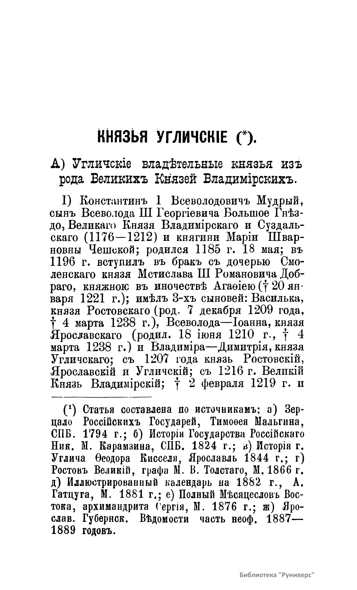 Брошюра содержит сведения об углических владетельных князьях из рода Великих князей владимирских; об углических владетельных князьях из рода Великих князей московских.