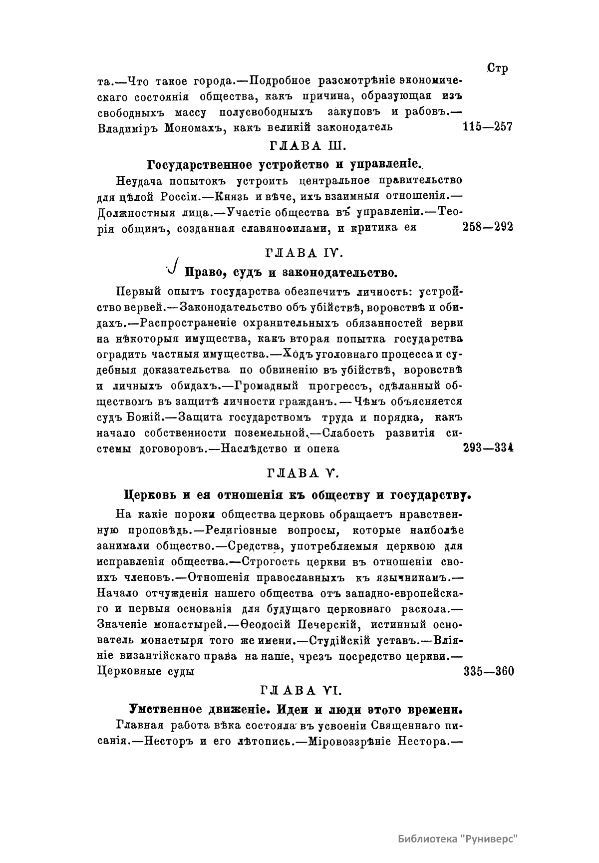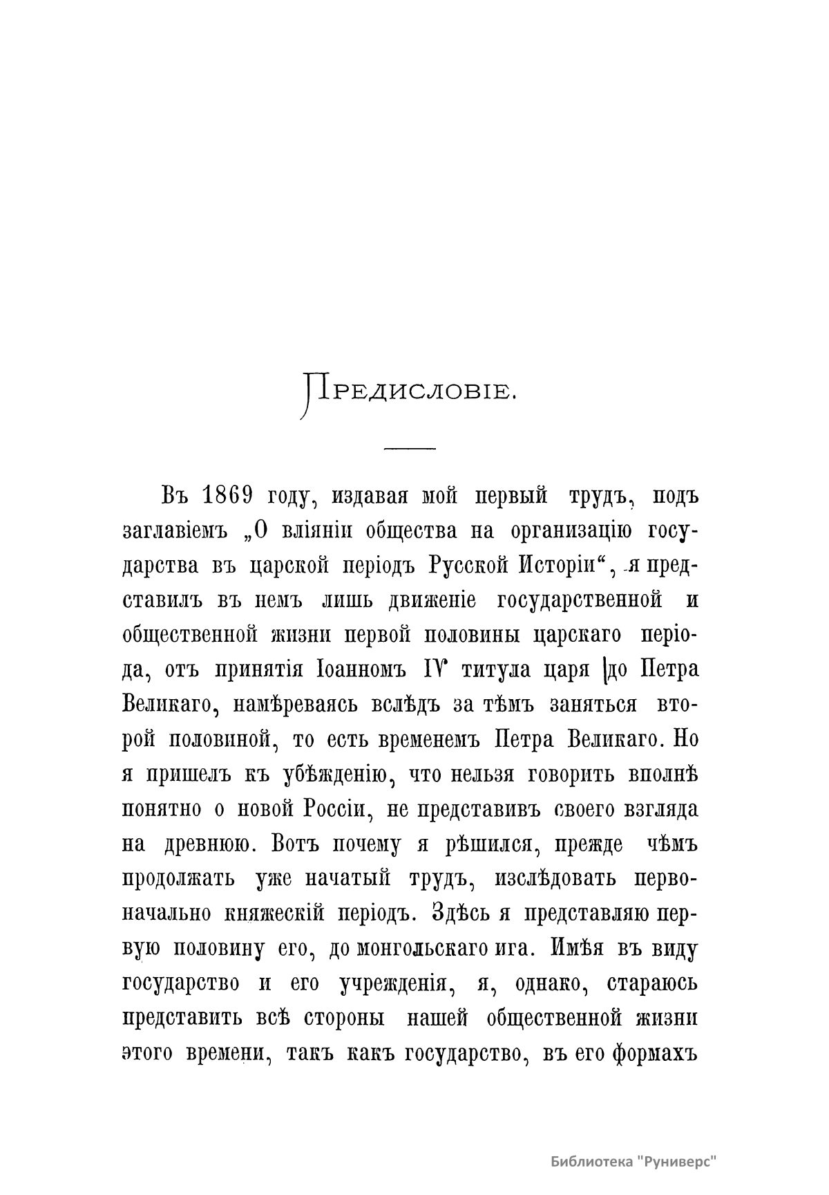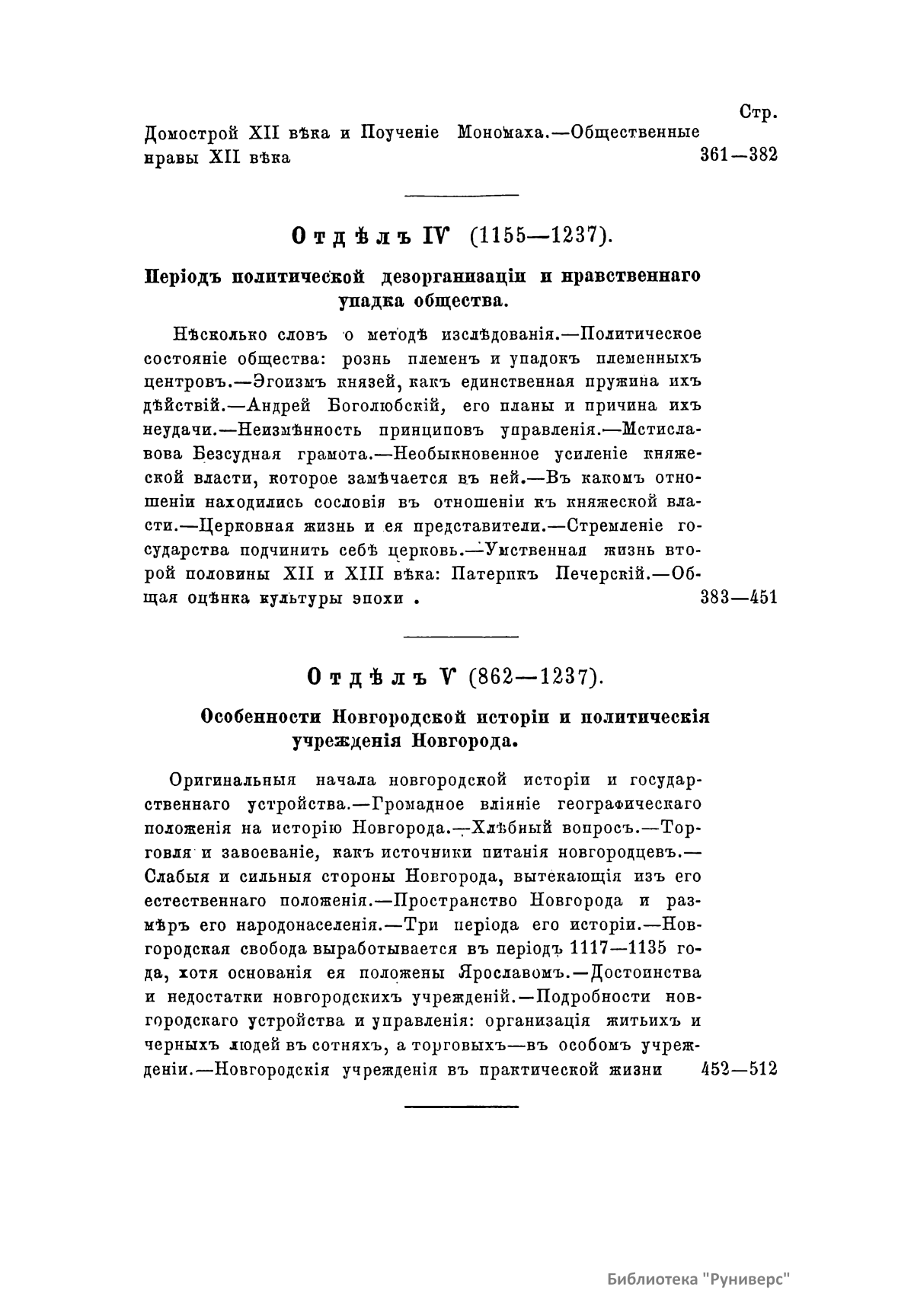 В книге рассматриваются следующие положения: Быт и политическое устройство славянских племен, вошедших в состав первоначального русского государства (до 862 г.). Период внешнего или механического соединения племен в одно государство. Период господства патриархальных идей и отношений (1055 – 1156). Общественные элементы. Государственное устройство и управление. Право, суд и законодательство. Церковь и ее отношение к обществу и государству. Умственное движение. Идеи и люди этого времени. Период политической дезорганизации и нравственного упадка общества (1155 – 1237). Особенности Новгородской истории и политические учреждения Новгорода (862 – 1237).