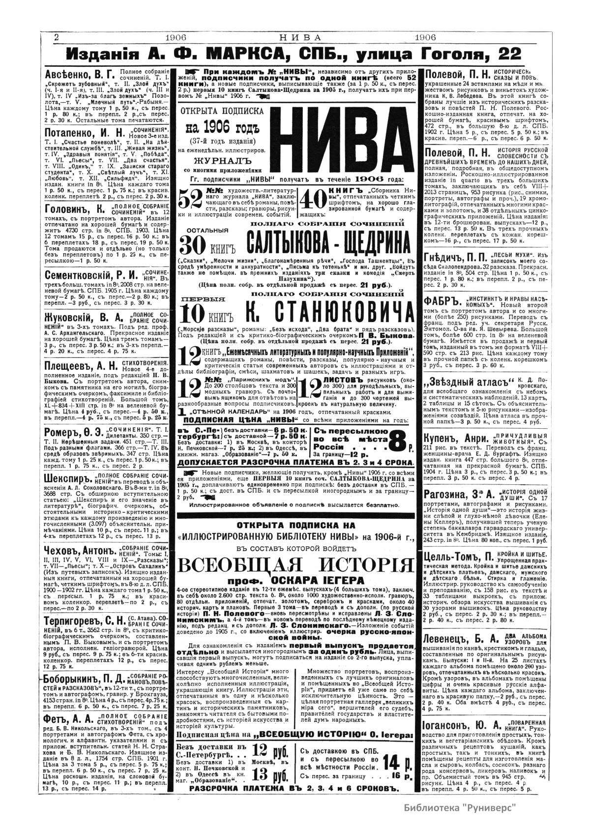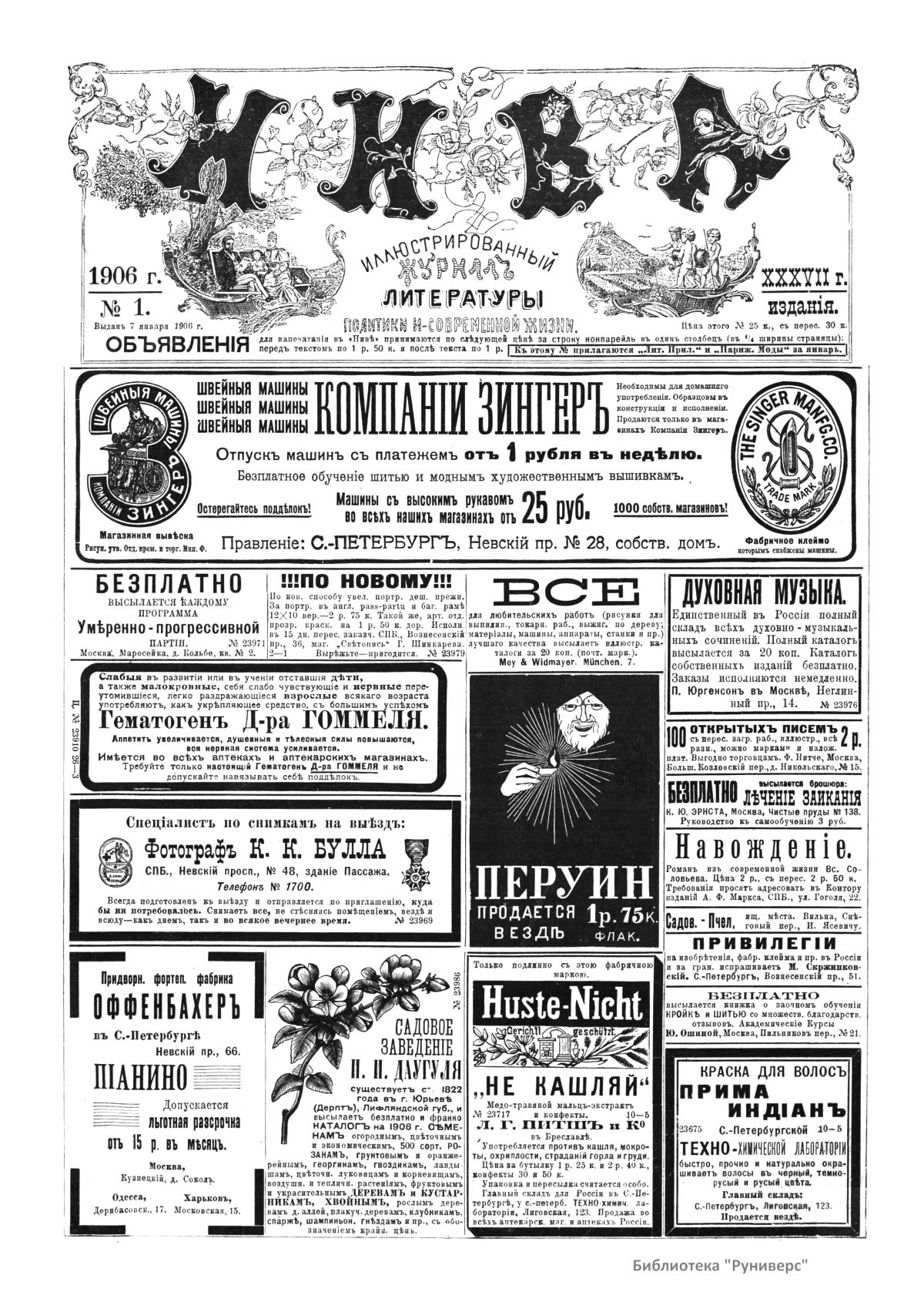 «Нива» — популярный еженедельный русский журнал с приложениями, издававшийся со второй половины XIX до начала XX века, носил подзаголовок «Журнал литературы, политики и современной жизни». Журнал был любимым детищем А. Ф. Маркса, возглавлявшего свое издательство вплоть до своей смерти в 1904 г. Позиционировалась «Нива» как иллюстрированный журнал для семейного чтения и был ориентирован, главным образом, на обывателя. В журнале публиковались литературные произведения, исторические, научно-популярные очерки, репродукции и гравюры картин современных художников. Материалы политического и общественного содержания также сопровождались многочисленными иллюстрациями. Среди известных литераторов, печатавшихся в журнале, были А. К. Толстой, Ф. И. Тютчев, Л. Н. Толстой, А. А. Фет, А. П. Чехов, Максим Горький, Корней Чуковский, Анна Ахматова, Иван Бунин и многие другие. Благодаря «Ниве» сочинения многих современных авторов добрались до самых отдаленных областей России.