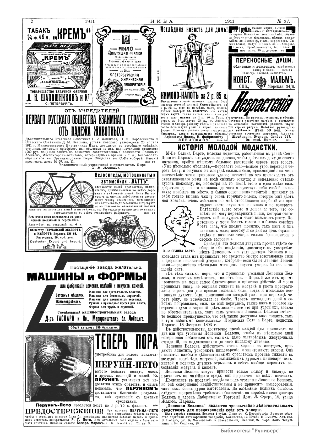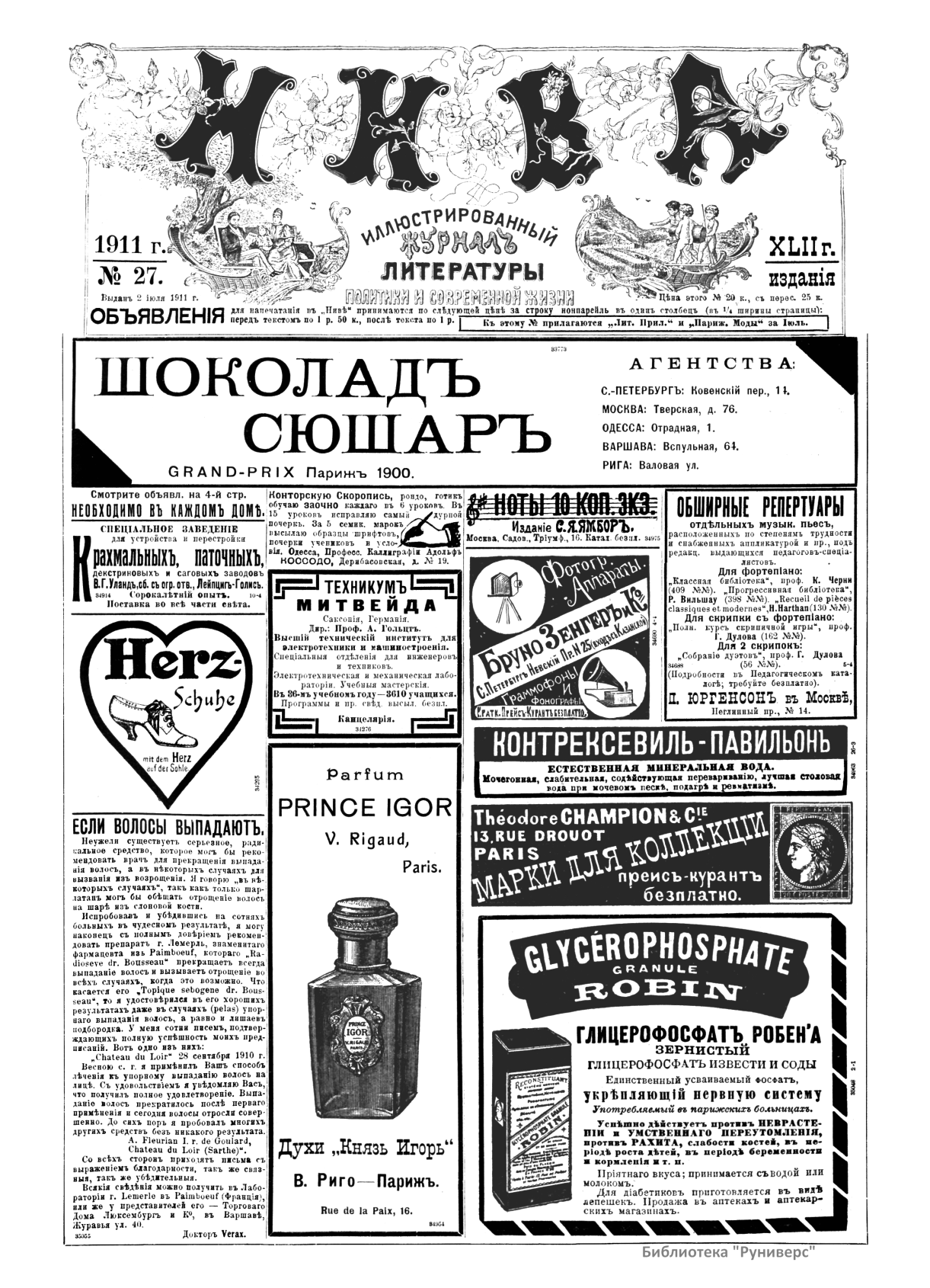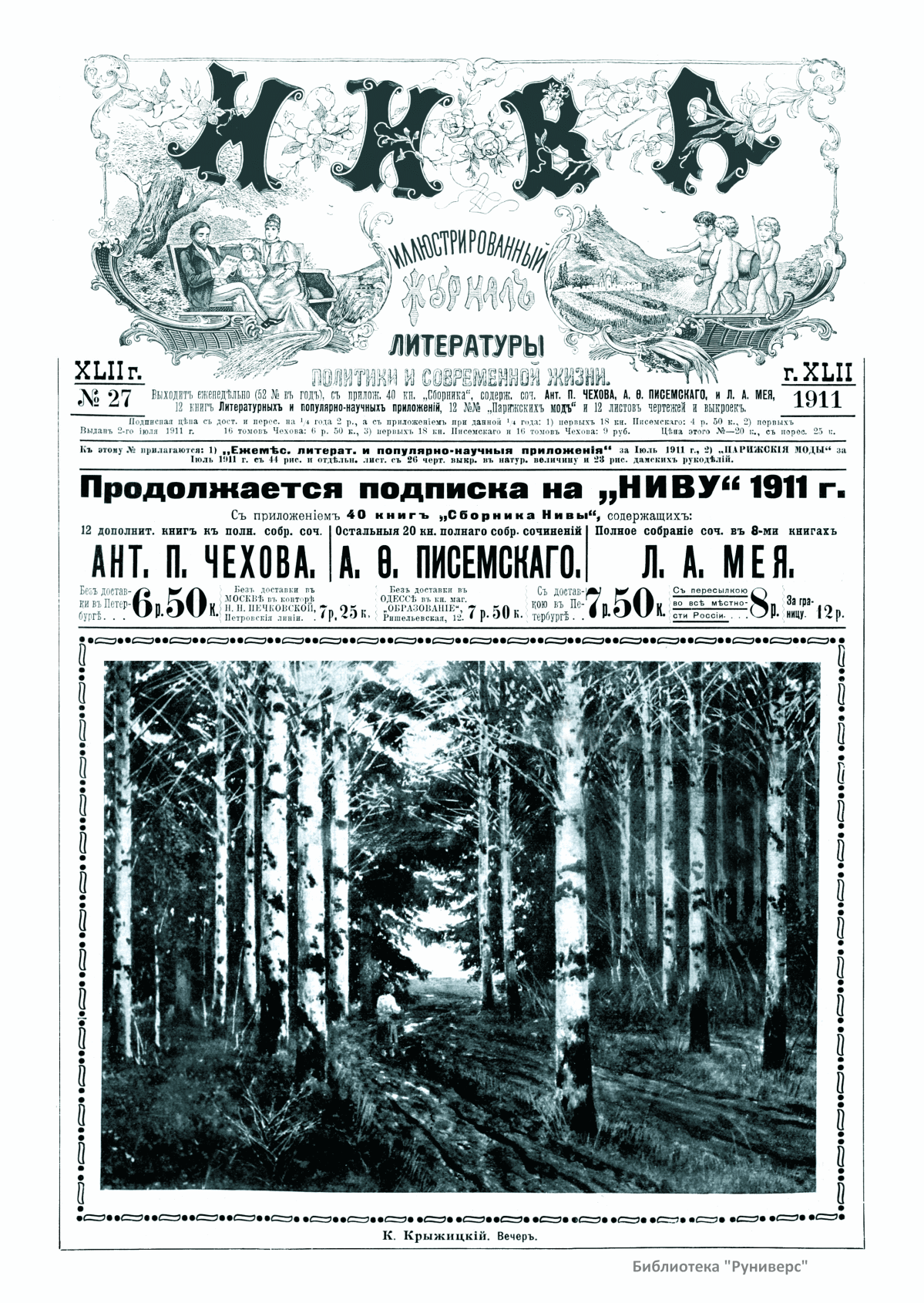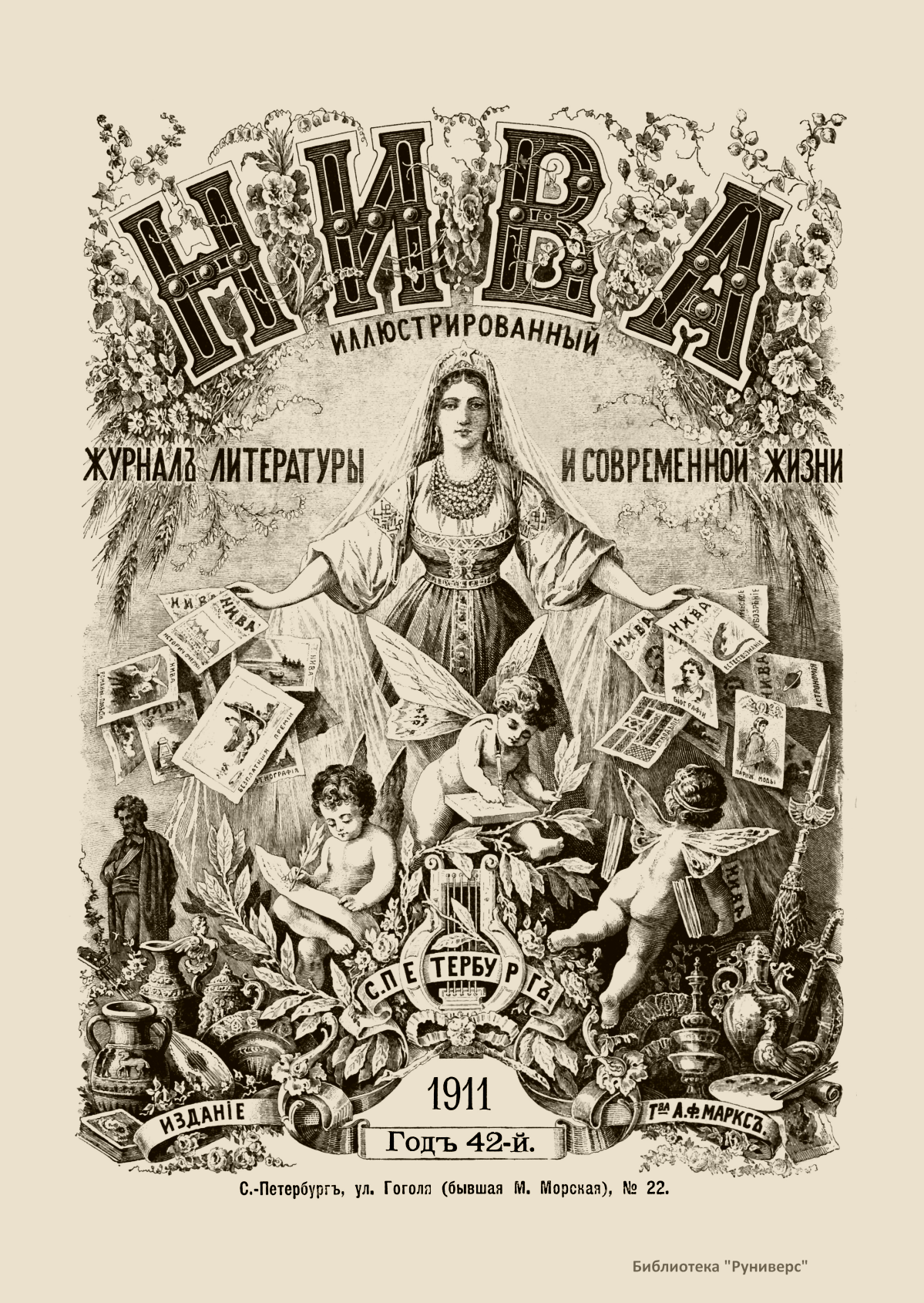«Нива» — популярный еженедельный русский журнал с приложениями, издававшийся со второй половины XIX до начала XX века, носил подзаголовок «Журнал литературы, политики и современной жизни». Журнал был любимым детищем А. Ф. Маркса, возглавлявшего свое издательство вплоть до своей смерти в 1904 г. Позиционировалась «Нива» как иллюстрированный журнал для семейного чтения и был ориентирован, главным образом, на обывателя. В журнале публиковались литературные произведения, исторические, научно-популярные очерки, репродукции и гравюры картин современных художников. Материалы политического и общественного содержания также сопровождались многочисленными иллюстрациями. Среди известных литераторов, печатавшихся в журнале, были А. К. Толстой, Ф. И. Тютчев, Л. Н. Толстой, А. А. Фет, А. П. Чехов, Максим Горький, Корней Чуковский, Анна Ахматова, Иван Бунин и многие другие. Благодаря «Ниве» сочинения многих современных авторов добрались до самых отдаленных областей России.