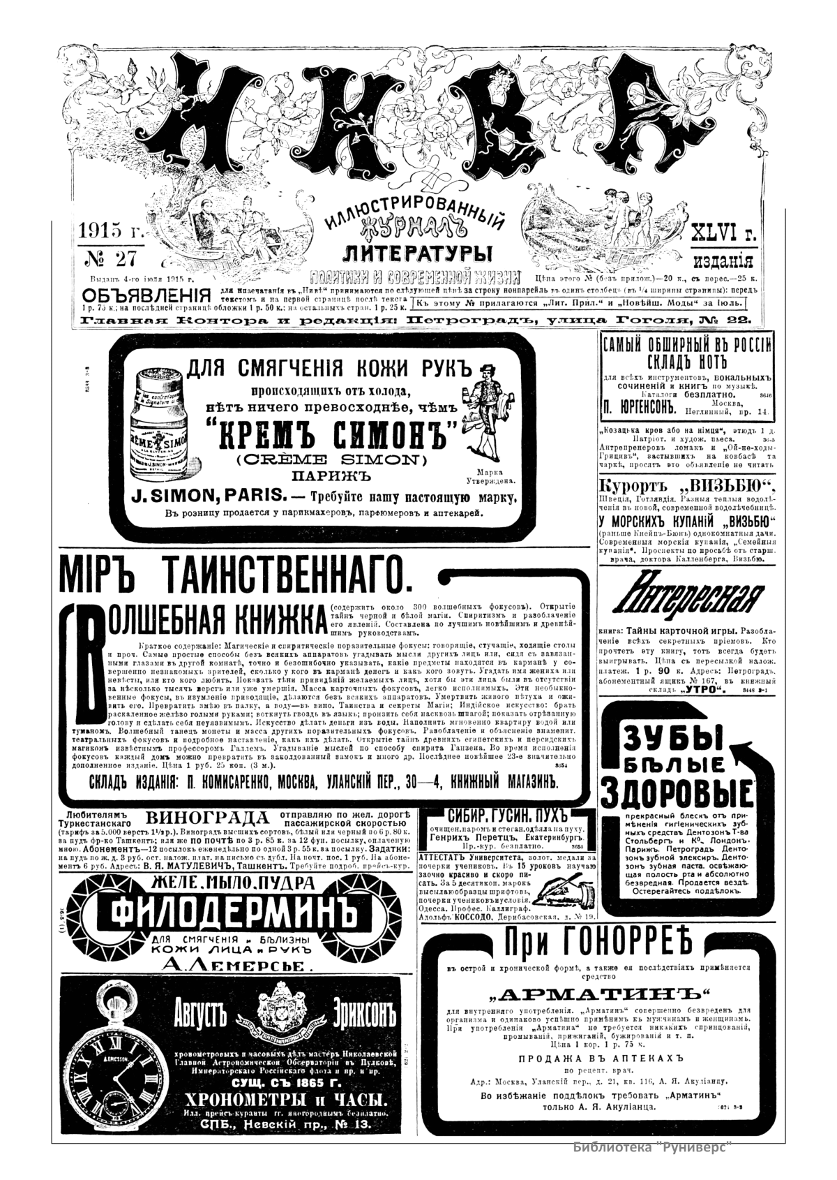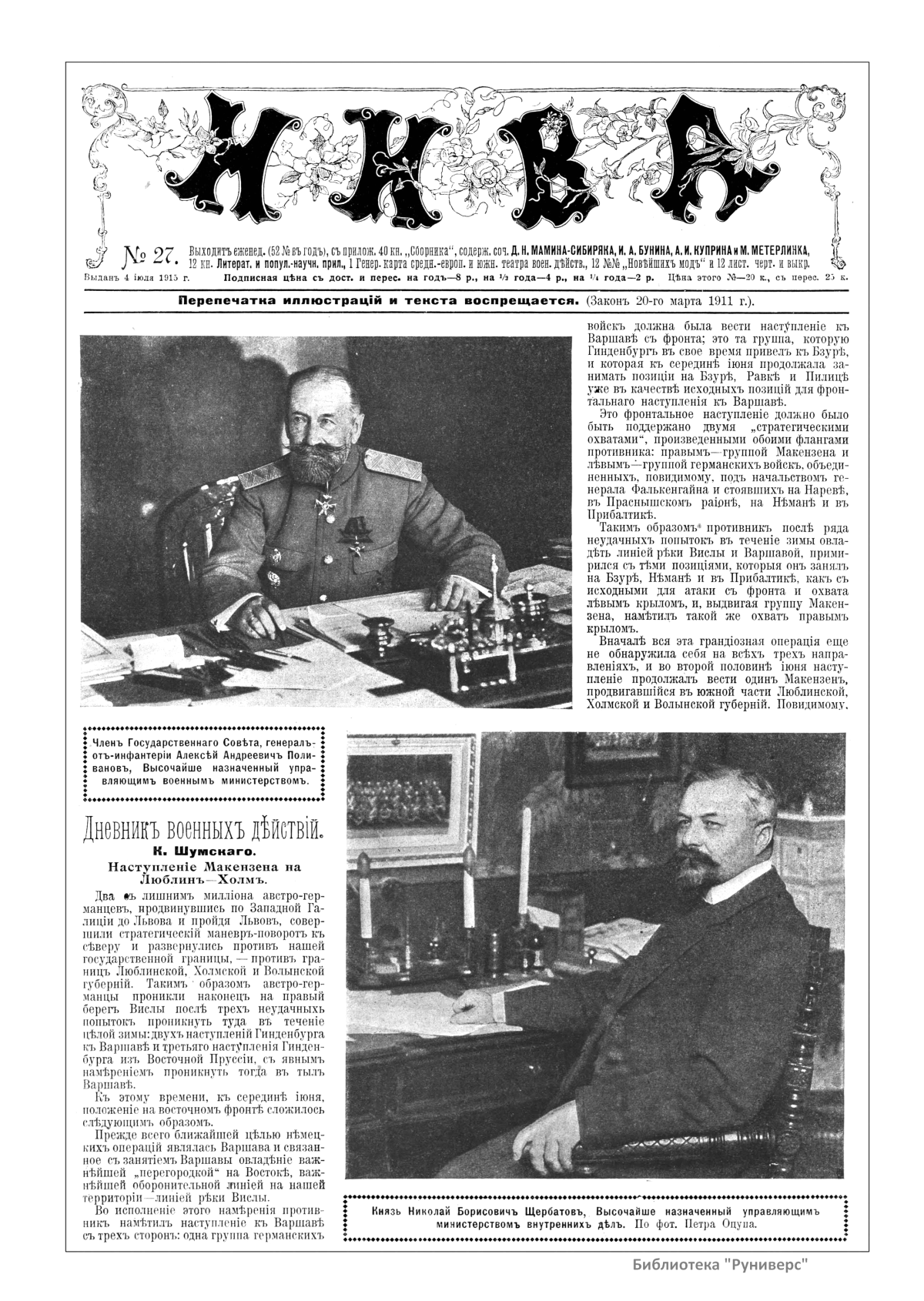 «Нива» — популярный еженедельный русский журнал с приложениями, издававшийся со второй половины XIX до начала XX века, носил подзаголовок «Журнал литературы, политики и современной жизни». Журнал был любимым детищем А. Ф. Маркса, возглавлявшего свое издательство вплоть до своей смерти в 1904 г. Позиционировалась «Нива» как иллюстрированный журнал для семейного чтения и был ориентирован, главным образом, на обывателя. В журнале публиковались литературные произведения, исторические, научно-популярные очерки, репродукции и гравюры картин современных художников. Материалы политического и общественного содержания также сопровождались многочисленными иллюстрациями. Среди известных литераторов, печатавшихся в журнале, были А. К. Толстой, Ф. И. Тютчев, Л. Н. Толстой, А. А. Фет, А. П. Чехов, Максим Горький, Корней Чуковский, Анна Ахматова, Иван Бунин и многие другие. Благодаря «Ниве» сочинения многих современных авторов добрались до самых отдаленных областей России.