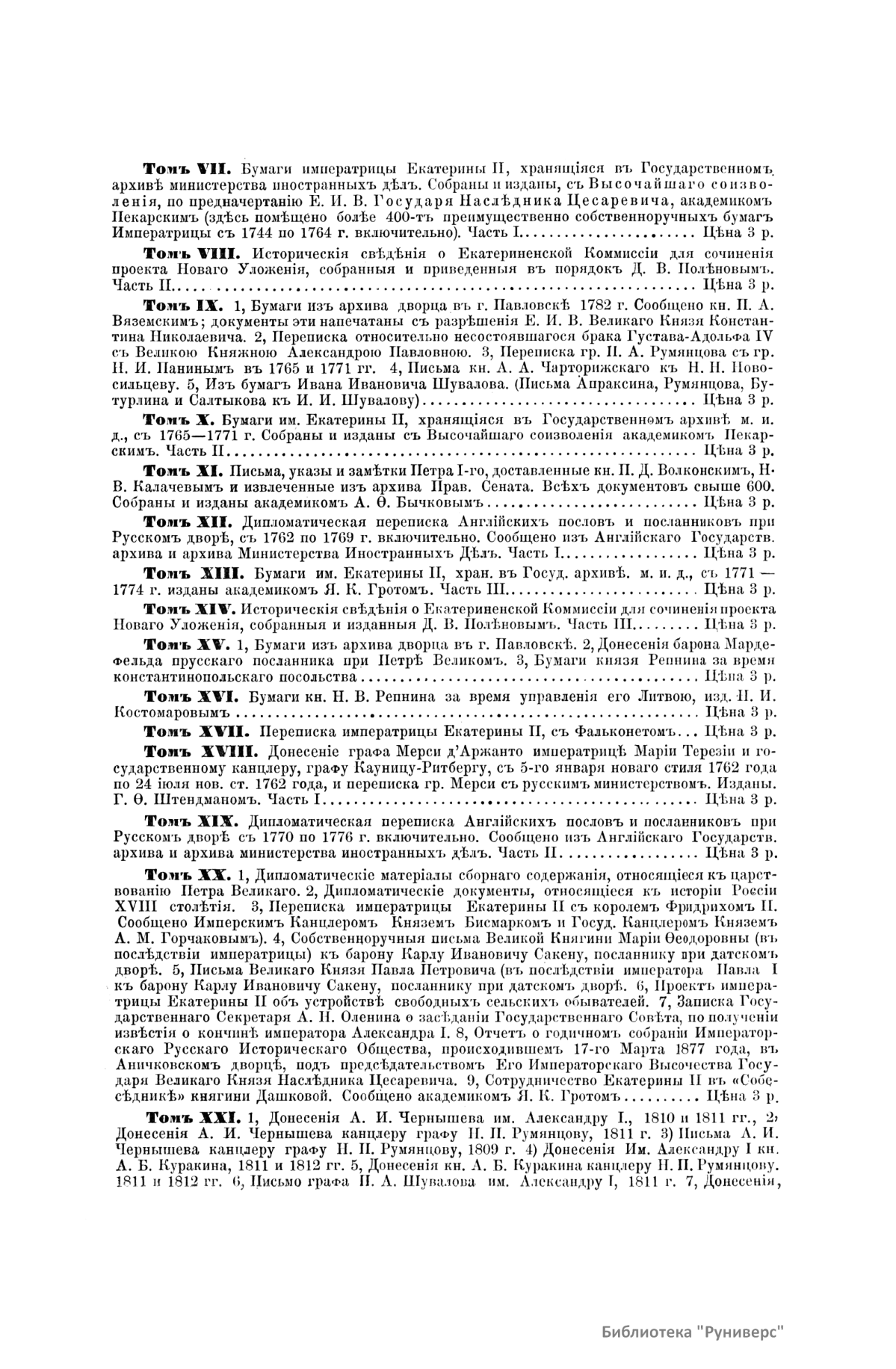 Сборники Русского исторического общества (РИО) – крупнейшая серийная публикация источников по истории России XVIII–XIX веков. За пятьдесят лет существования Общества (1866–1916) было выпущено 148 томов Сборника. Тематика опубликованных в Сборнике материалов обширна и включает в себя документы, относящиеся как к внутренней, так и внешней политике государства. Среди них можно выделить шесть крупных серий: «Материалы по истории Екатерининской комиссии для сочинения проекта нового Уложения 1767 г.», «Бумаги Екатерины II», «Материалы для истории высших государственных учреждений России в XVIII в.», «Материалы для политической и бытовой истории в 1812 г.», «Дипломатическая переписка иностранных послов и посланников при русском дворе», «Памятники дипломатических отношений древней России с державами иностранными», включающие документы XV–XVII веков, перешедшие в РИО от Второго отделения императорской канцелярии. Помимо этих серий в Сборнике публиковались личные бумаги Петра I, Петра II, Екатерины I, Александра I, Николая I, Александра II, а также документы, связанные с деятельностью видных государственных сановников. В Сборнике выходили отчёты о годичных собраниях РИО. Во время подготовки издания Русского биографического словаря в томах 60 и 62 был помещён Азбучный указатель имён русских деятелей для словаря. Основная работа по подготовке издания Сборника лежала на ответственных секретарях РИО. Первым таким секретарём стал один из наиболее деятельных организаторов Общества А. А. Половцев. В разное время в работе Общества принимали участие крупные историки: С. М. Соловьёв, В. О. Ключевский, Н. И. Костомаров, Н. Ф. Дубровин, П. П. Пекарский, В. И. Сергеевич, Я. К. Грот, А. Н. Филиппов, И. Е. Забелин, А. Н. Пыпин, С. Ф. Платонов, В. С. Иконников, Н. Д. Чечулин, А. Н. Попов.