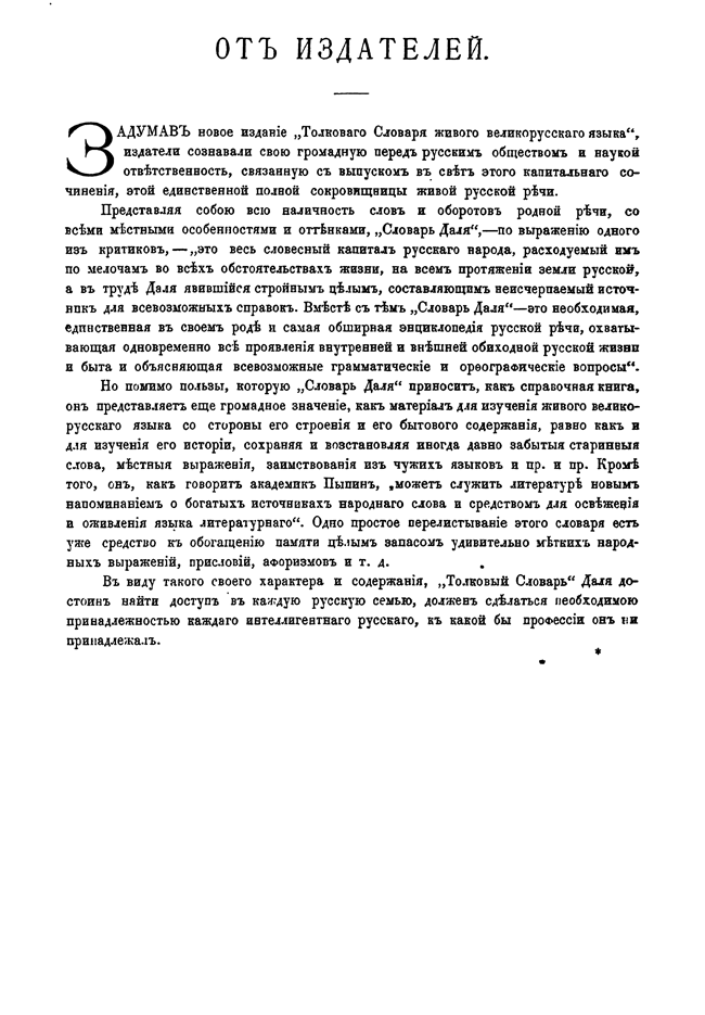 Настоящее издание является третьим со времени выхода в свет в 1863 – 1866 гг. первого издания Толкового словаря живого великорусского языка. Наряду с лексикой литературного языка первой половины XIX века, то есть языка Пушкина и Гоголя, в словаре представлены областные слова, а также терминология разных профессий и ремёсел. Словарь содержит громадный иллюстративный материал, в котором первое место принадлежит пословицам и поговоркам. По оценке академика В. В. Виноградова, «как сокровищница меткого народного слова, словарь Даля будет спутником не только литератора, филолога, но и всякого образованного человека».