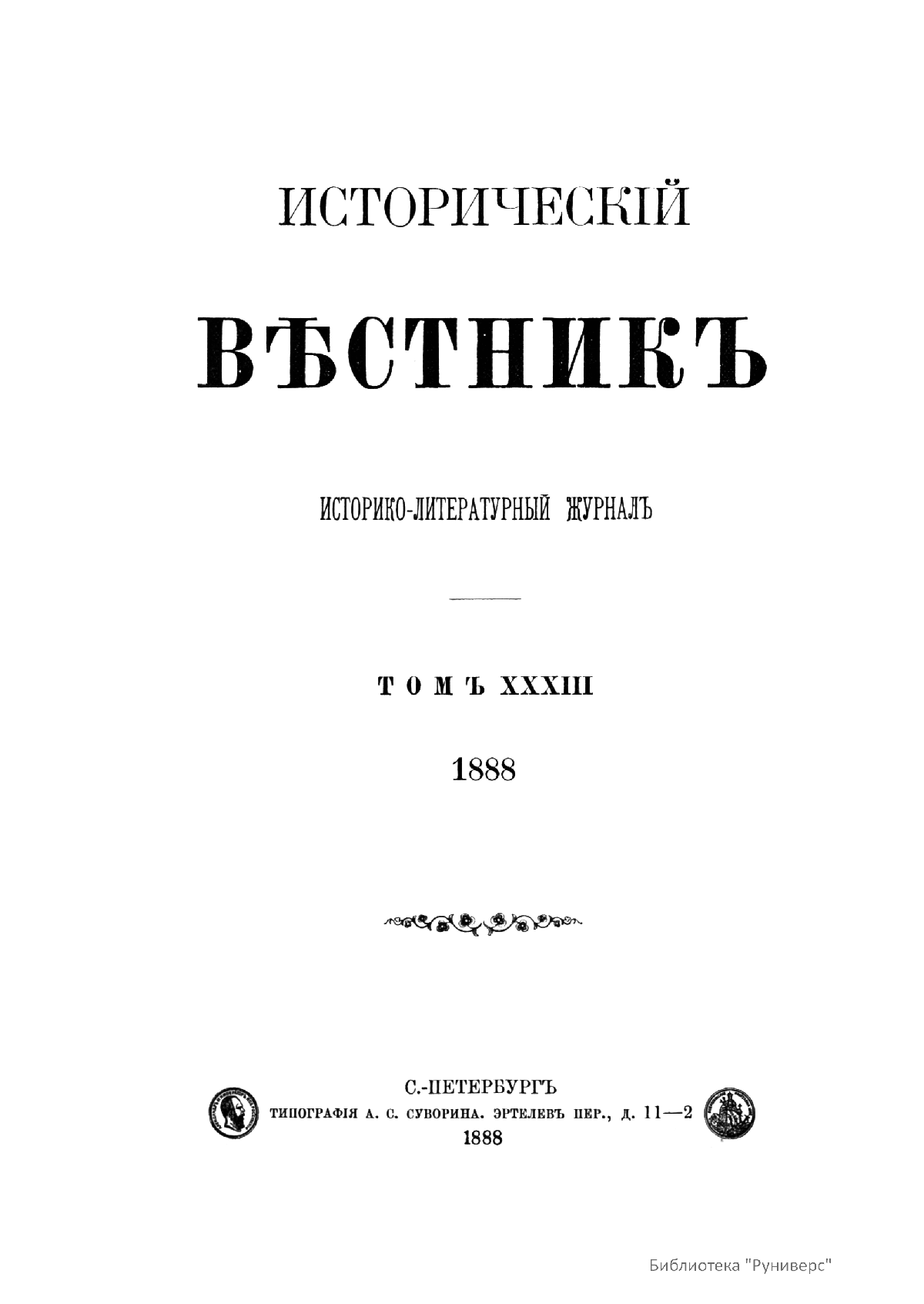 «Исторический вестник» - русский ежемесячный историко-литературный журнал. Издавался в Санкт-Петербурге с 1880-го по 1917 г. Журнал был основан А.С. Сувориным и С.Н. Шубинским с целью «знакомить читателей в живой, общедоступной форме с современным состоянием исторической науки и литературы в России и Европе». Вышло 150 тт. Каждый том состоял из трёх ежемесячных выпусков, имел свою нумерацию страниц, оглавление, список иллюстраций. Журнал приобрёл устойчивую популярность среди читателей, заняв прочное место в «триумвирате» русских исторических журналов наряду с «Русским архивом» и «Русской стариной». опережая их по количеству подписчиков. Отличием «Исторического вестника» было то, что он не помещал на своих страницах необработанных, сырых материалов. С другой стороны, журнал приближался по своему типу к журналам общелитературного образца, сочетая в себе коммерческий успех и доступное изложение материала.