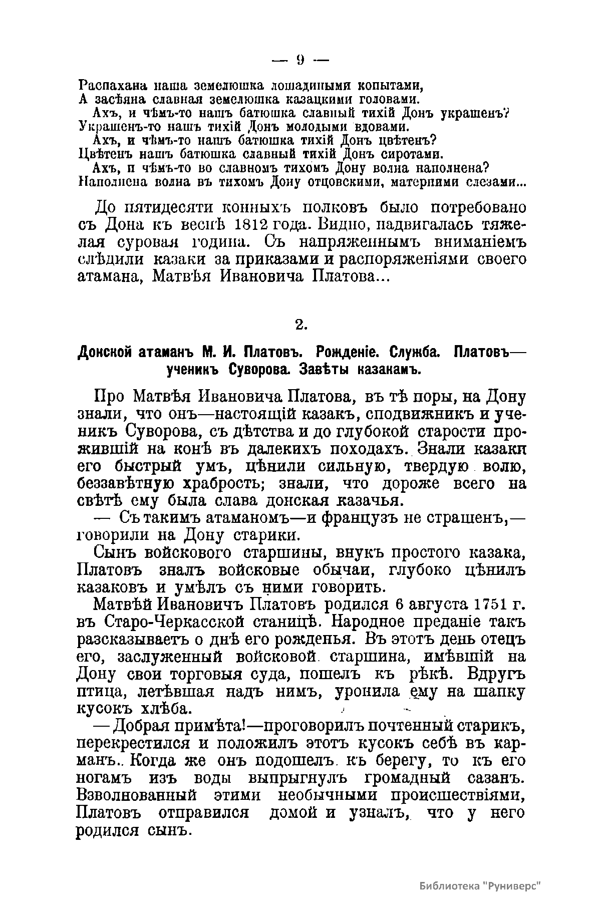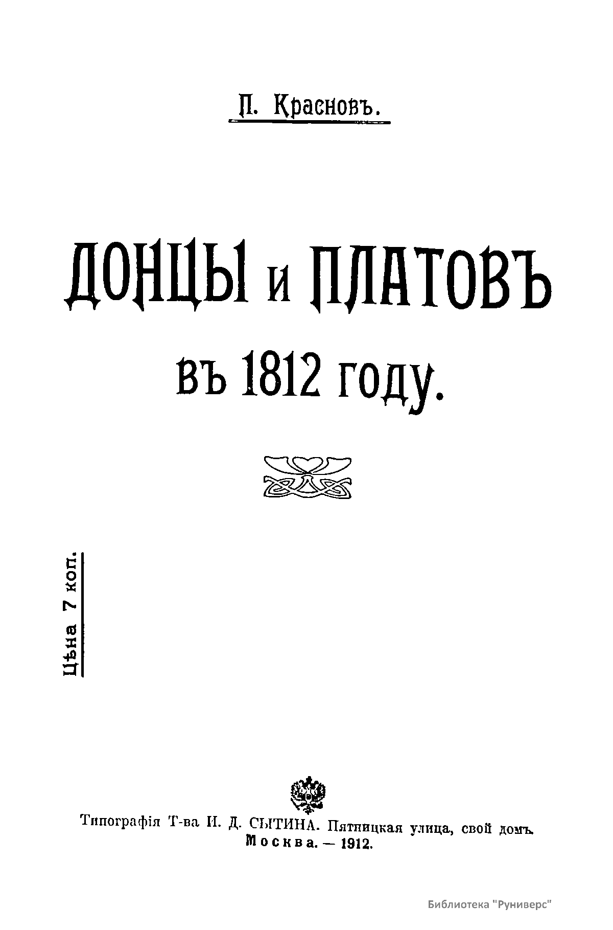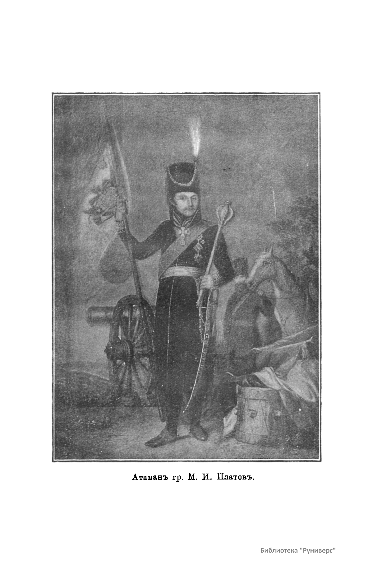 В книге изложена биография Платова М.И., подробно описано его участие в войне 1812 г. Платов Матвей Иванович (1751 – 1818) – граф (с 1812 г.), войсковой атаман Донского казачьего войска, генерал от кавалерии. Сподвижник А.В. Суворова. В Отечественную войну 1812 г. и в 1813 – 1814 гг. успешно командовал донским казачьим корпусом. В Бородинском сражении совершил рейд в тыл противника.