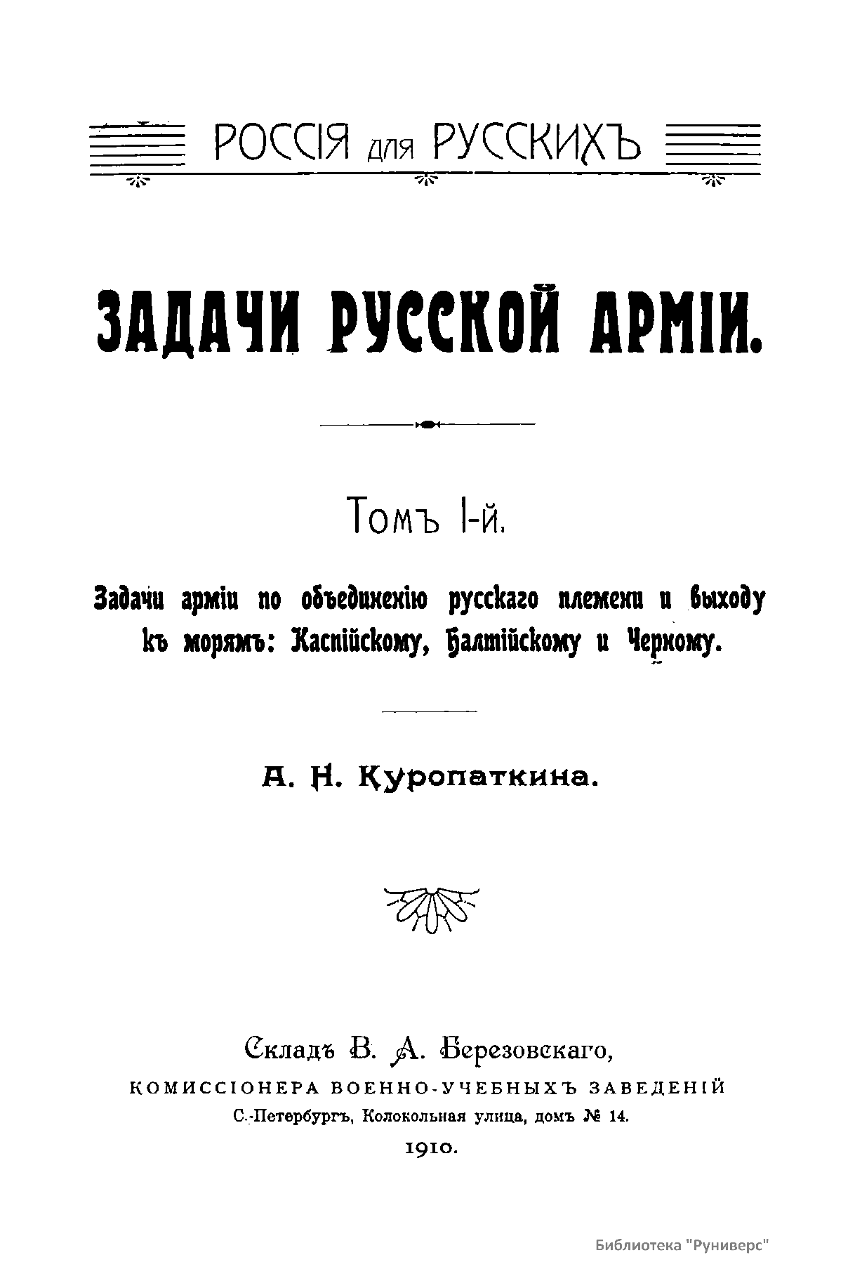 Том I-й. Задачи армии по объединению русского племени и выходу к морям: Каспийскому, Балтийскому и Черному