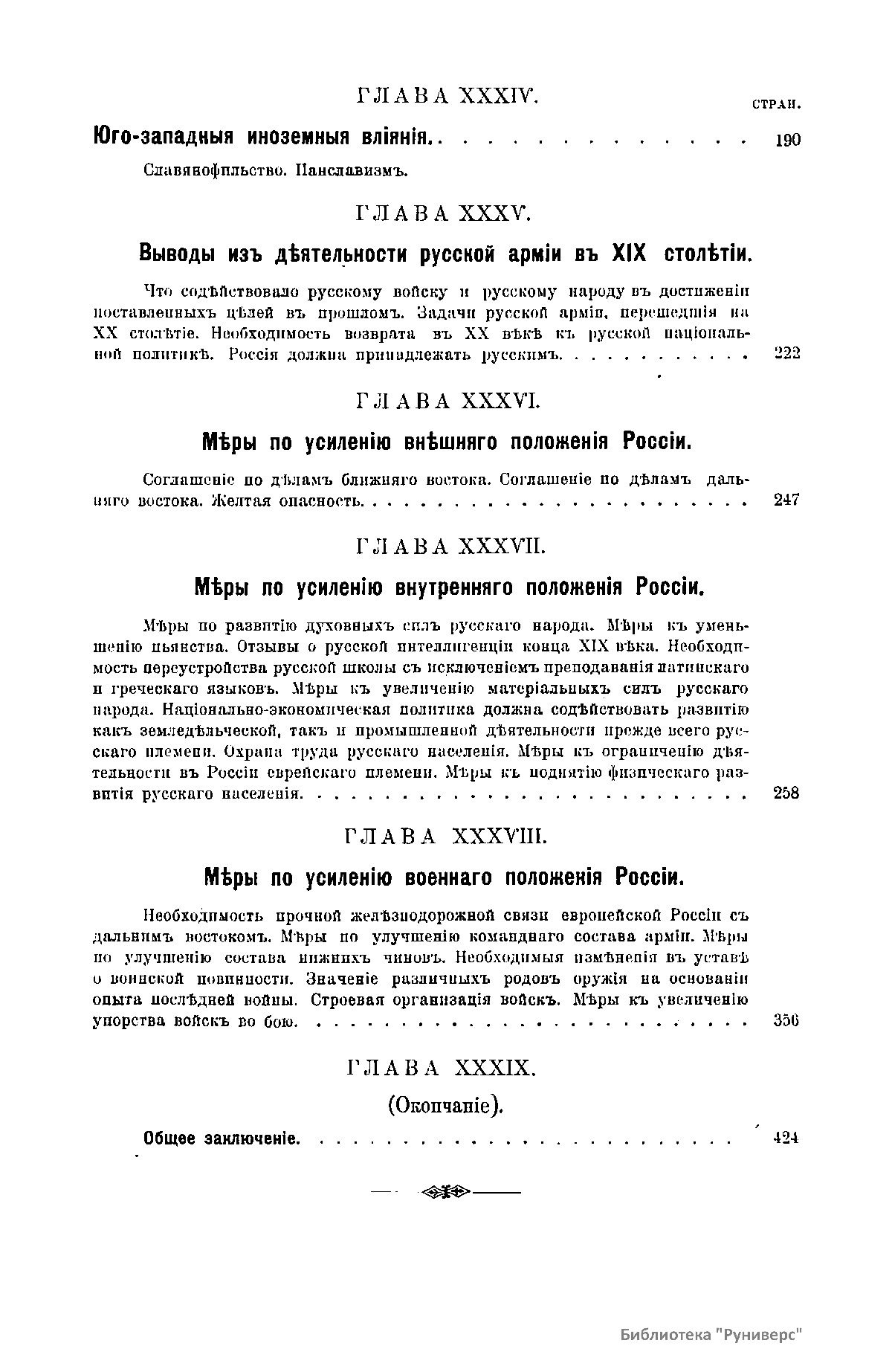 В настоящем издании автор рассуждает об исторических путях России и будущих задачах русской армии. В первом томе изложены задачи русской армии в XV – XVIII вв., выполненные ею в целях объединения русского племени и расширения пределов России до естественных рубежей: морей Балтийского, Черного и Каспийского, океанов Ледовитого и Восточного. Здесь говорится о том, какие русскому народу потребовались усилия, чтобы выйти победителем из борьбы с татарами, литовцами, поляками, ливонцами, шведами, турками и создать могущественное русское государство. По мнению автора, основными двигателями к подвигу во все века были: глубокая вера, преданность царю и любовь к родине. Во второй том вошли главным образом войны в начале XIX столетия с Наполеоном I и войны освободительного характера на Балканском полуострове. Главное внимание правительственной власти в это время ушло на устройство европейских дел, в том числе и на устройство на Балканском полуострове независимых государств. Автор считает, что такая политика, а также западные влияния пошли в ущерб русскому племени и способствовали отсталости России в материальном и духовном отношении от европейских государств. В третьем томе говорится о положении России к концу XIX в. и намечены главные задачи России и русской армии в XX в. Для того чтобы эти задачи были выполнены, необходимо, по мнению автора, вернуться к русской национальной политике.
