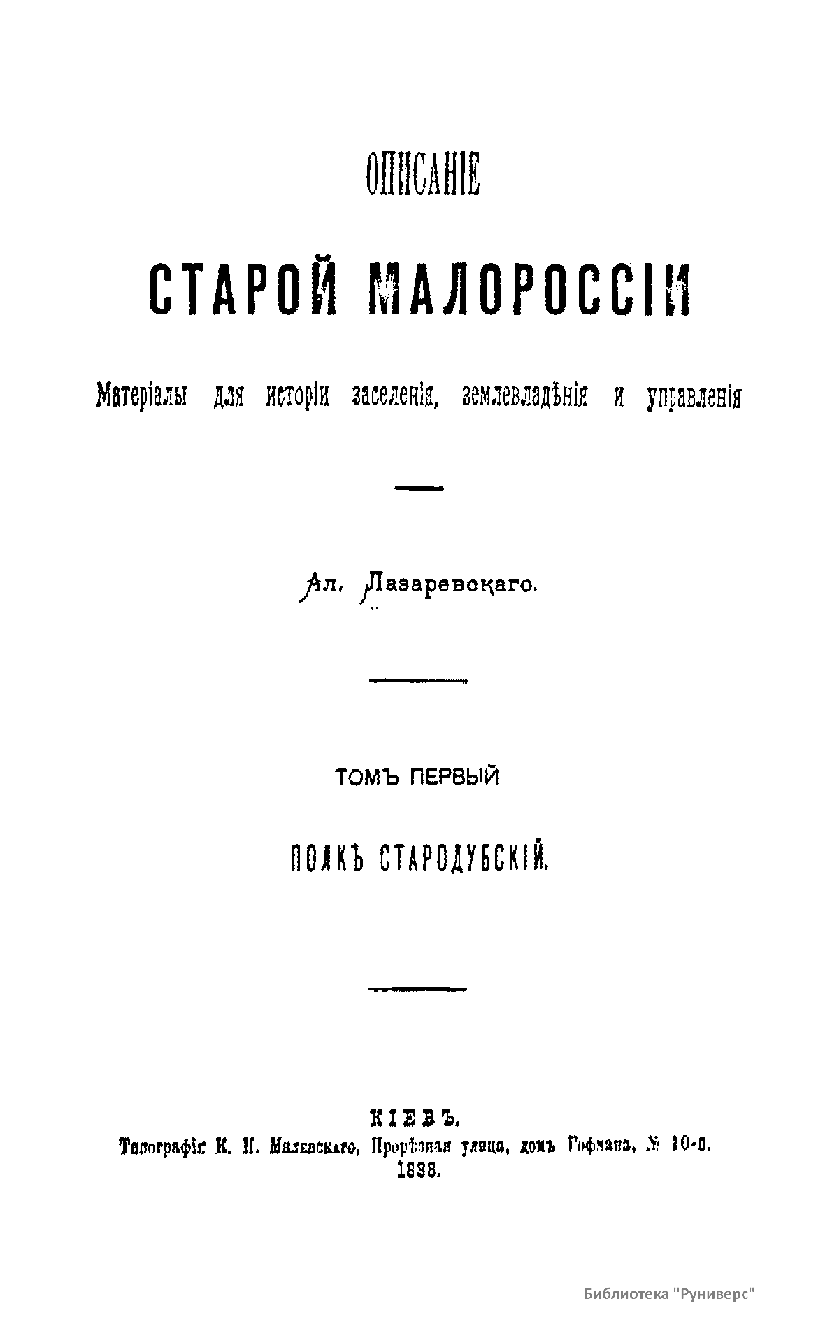 Описанiе старой Малороссiи. Матерiалы для исторiи заселенiя, землевладѣнiя и управленiя