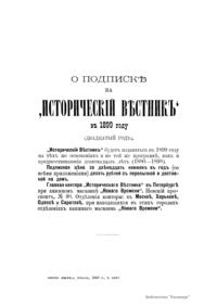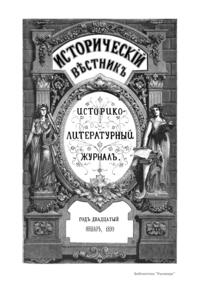 «Исторический вестник» - русский ежемесячный историко-литературный журнал. Издавался в Санкт-Петербурге с 1880-го по 1917 г. Журнал был основан А.С. Сувориным и С.Н. Шубинским с целью «знакомить читателей в живой, общедоступной форме с современным состоянием исторической науки и литературы в России и Европе». Вышло 150 тт. Каждый том состоял из трёх ежемесячных выпусков, имел свою нумерацию страниц, оглавление, список иллюстраций. Журнал приобрёл устойчивую популярность среди читателей, заняв прочное место в «триумвирате» русских исторических журналов наряду с «Русским архивом» и «Русской стариной». опережая их по количеству подписчиков. Отличием «Исторического вестника» было то, что он не помещал на своих страницах необработанных, сырых материалов. С другой стороны, журнал приближался по своему типу к журналам общелитературного образца, сочетая в себе коммерческий успех и доступное изложение материала.