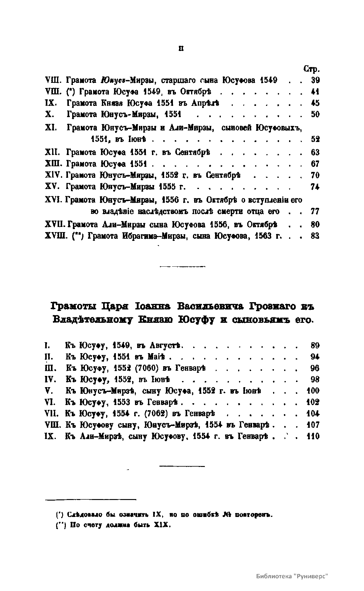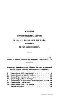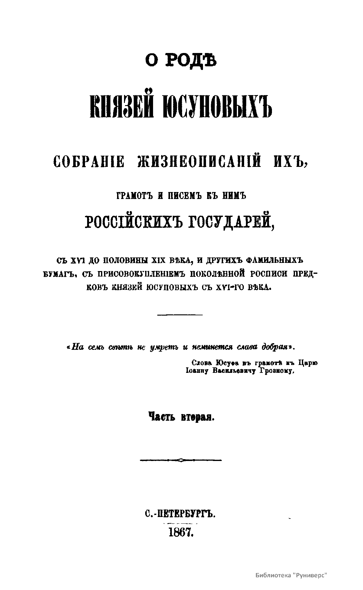 О родѣ князей Юсуповыхъ, собранiе жизнеописанiй ихъ, грамотъ и писемъ къ нимъ россiйскихъ государей, съ XVI до половины XIX вѣка и другихъ фамильныхъ бумагъ, съ присовокупленiемъ поколѣнной росписи предковъ князей Юсуповыхъ съ XIV-го вѣка. Часть вторая