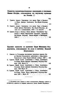 Первую часть составляют отдельные жизнеописания представителей рода князей Юсуповых. Во второй части опубликованы исторические акты с XIV до половины XIX века
