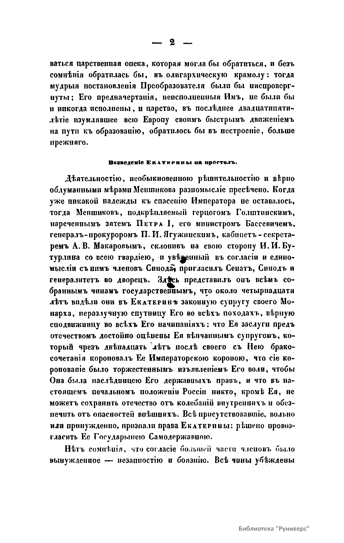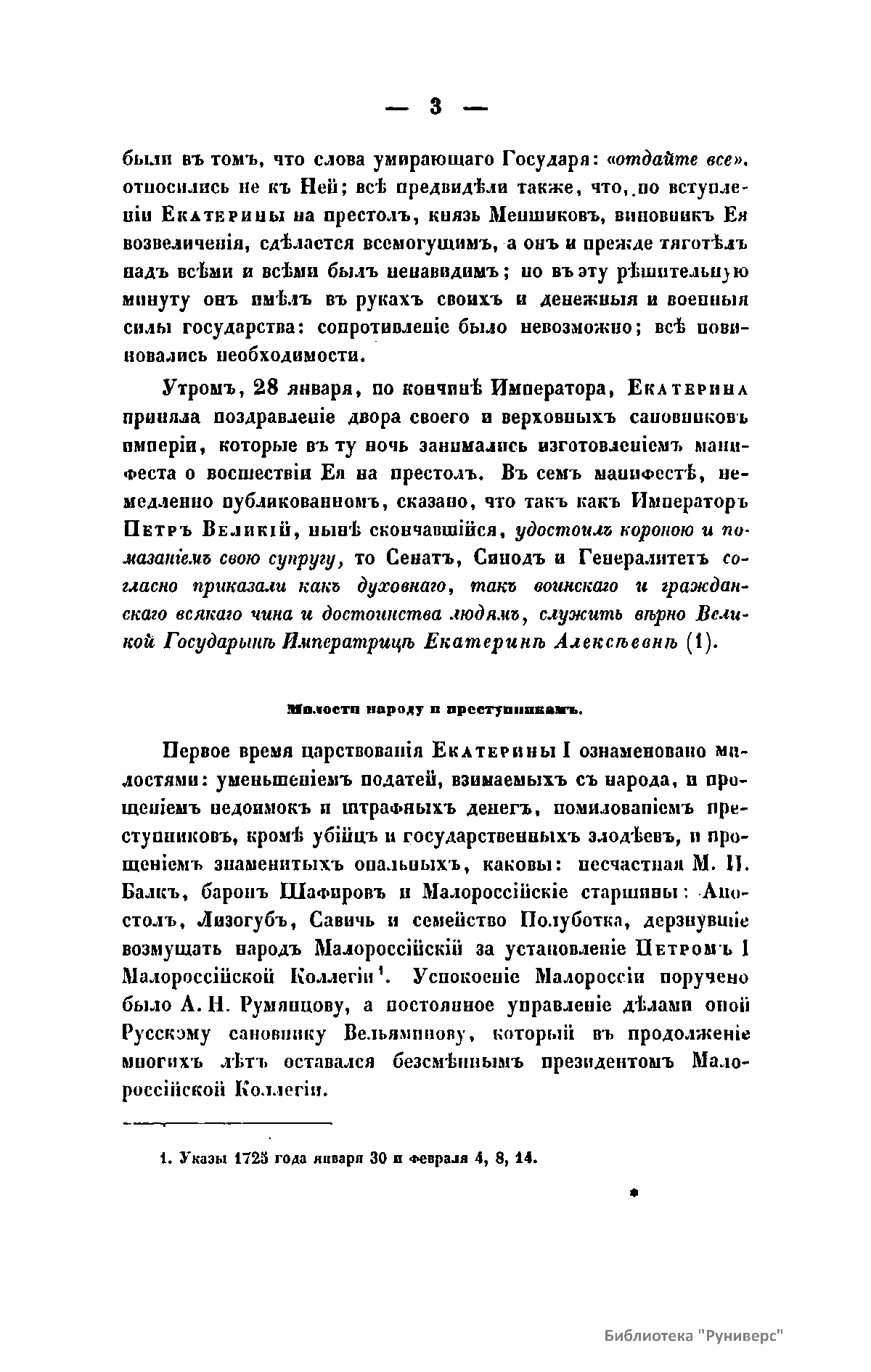 Небольшое исследование царствования Екатерины I (1725 – 1727). Автор показывает, что во все время своего царствования Екатерина следовала по пути, указанному России великим ее преобразователем Петром I.