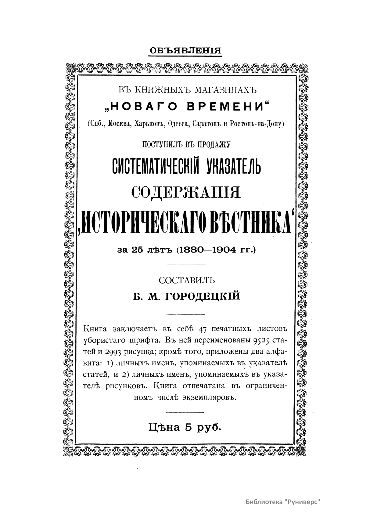 «Исторический вестник» - русский ежемесячный историко-литературный журнал. Издавался в Санкт-Петербурге с 1880-го по 1917 г. Журнал был основан А.С. Сувориным и С.Н. Шубинским с целью «знакомить читателей в живой, общедоступной форме с современным состоянием исторической науки и литературы в России и Европе». Вышло 150 тт. Каждый том состоял из трёх ежемесячных выпусков, имел свою нумерацию страниц, оглавление, список иллюстраций. Журнал приобрёл устойчивую популярность среди читателей, заняв прочное место в «триумвирате» русских исторических журналов наряду с «Русским архивом» и «Русской стариной». опережая их по количеству подписчиков. Отличием «Исторического вестника» было то, что он не помещал на своих страницах необработанных, сырых материалов. С другой стороны, журнал приближался по своему типу к журналам общелитературного образца, сочетая в себе коммерческий успех и доступное изложение материала.