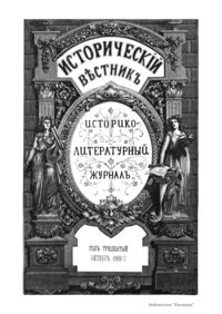 «Исторический вестник» - русский ежемесячный историко-литературный журнал. Издавался в Санкт-Петербурге с 1880-го по 1917 г. Журнал был основан А.С. Сувориным и С.Н. Шубинским с целью «знакомить читателей в живой, общедоступной форме с современным состоянием исторической науки и литературы в России и Европе». Вышло 150 тт. Каждый том состоял из трёх ежемесячных выпусков, имел свою нумерацию страниц, оглавление, список иллюстраций. Журнал приобрёл устойчивую популярность среди читателей, заняв прочное место в «триумвирате» русских исторических журналов наряду с «Русским архивом» и «Русской стариной». опережая их по количеству подписчиков. Отличием «Исторического вестника» было то, что он не помещал на своих страницах необработанных, сырых материалов. С другой стороны, журнал приближался по своему типу к журналам общелитературного образца, сочетая в себе коммерческий успех и доступное изложение материала.