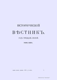 «Исторический вестник» - русский ежемесячный историко-литературный журнал. Издавался в Санкт-Петербурге с 1880-го по 1917 г. Журнал был основан А.С. Сувориным и С.Н. Шубинским с целью «знакомить читателей в живой, общедоступной форме с современным состоянием исторической науки и литературы в России и Европе». Вышло 150 тт. Каждый том состоял из трёх ежемесячных выпусков, имел свою нумерацию страниц, оглавление, список иллюстраций. Журнал приобрёл устойчивую популярность среди читателей, заняв прочное место в «триумвирате» русских исторических журналов наряду с «Русским архивом» и «Русской стариной». опережая их по количеству подписчиков. Отличием «Исторического вестника» было то, что он не помещал на своих страницах необработанных, сырых материалов. С другой стороны, журнал приближался по своему типу к журналам общелитературного образца, сочетая в себе коммерческий успех и доступное изложение материала.