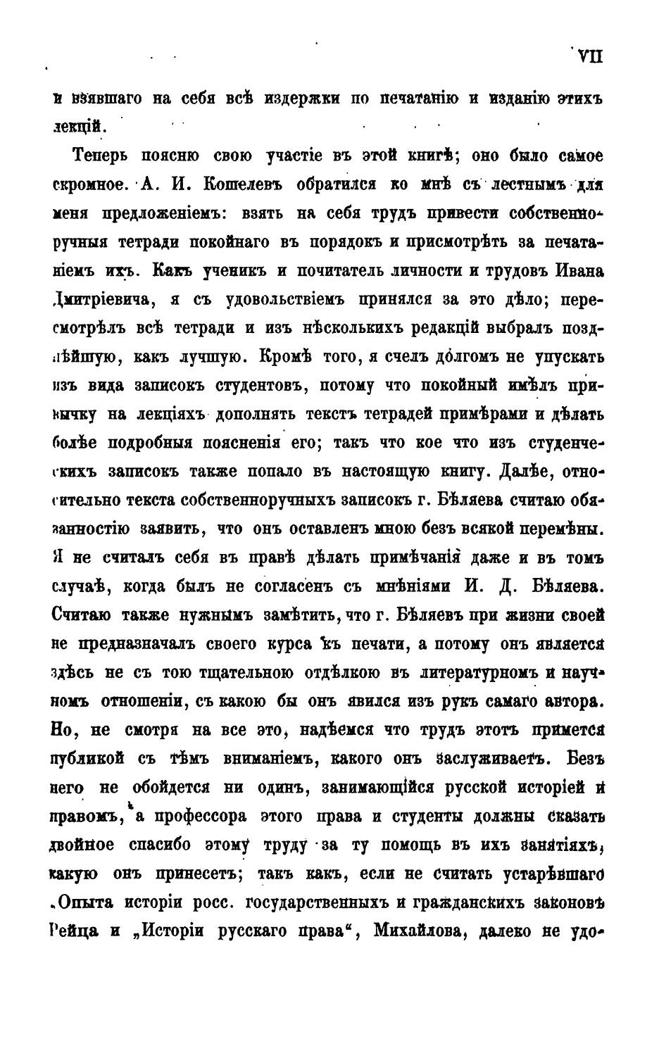 Довольно трудно разбирать эту книгу покойного Беляева, увидевшую свет уже немало времени спустя по смерти ее автора. Беляев был одним из трудолюбивейших ученых, каких знает наша литература. Немногие потрудились больше его над изучением истории своего отечества. В продолжении 30 лет с лишком в различных журналах и отдельными изданиями выходили его труды по истории России, преимущественно древней, и многие из этих исследований доселе не потеряли своей цены. Две из его монографий - «О наследстве без завещания по древним русским законам» (1858 г.) и «Крестьяне на Руси» (1860 г.),- можно думать, еще долго будут надобиться специалисту не для библиографических только справок. Многие из его трудов даже переживут те научные выводы, которые в них сделаны исследователем, благодаря обильным и любопытным выпискам из неизданных доселе актов, в них приводимых. Беляев был одним из лучших знатоков архивного материала по истории русского права. Учено-литературными работами не ограничивалась его деятельность: он 20 лет занимал кафедру истории русского права в Московском университете, и наибольшее количество научных сведений по этому предмету, какие выносили поколения юристов, вышедших в продолжение этого времени из названного университета, принадлежало Беляеву. Эти сведения теперь стали доступны читающей публике в курсе, изданном под редакцией одного ив многочисленных его учеников, г. Петровского, при материальном содействии г. Кошелева.