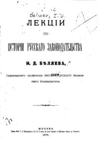 «Лекции по истории русского законодательства», И. Д. Беляева, ординарного профессорам Московского университета. М., 1879.