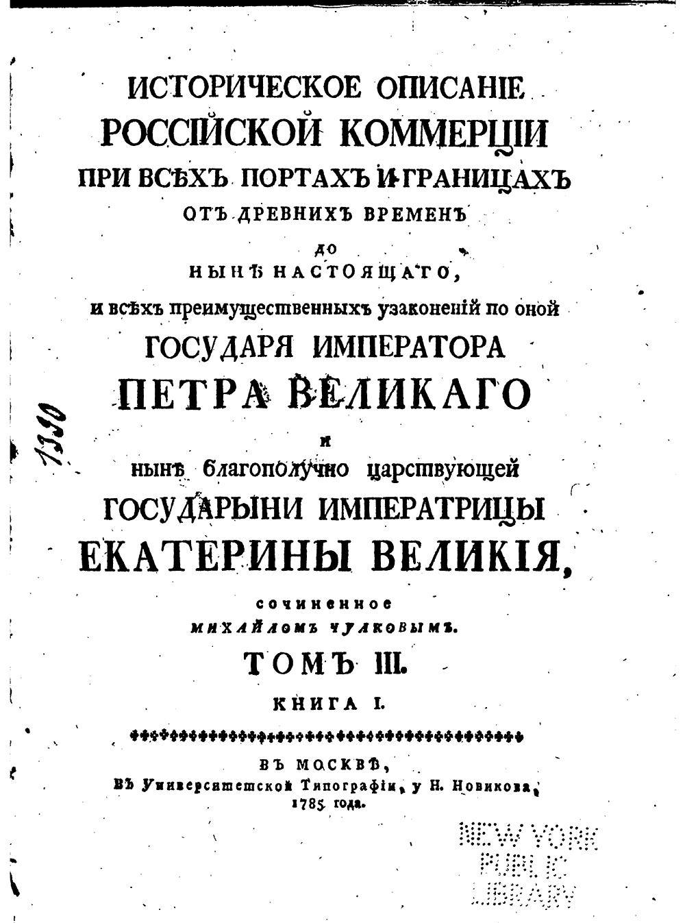 Историческое описанiе Россiйской коммерцiи при всѣхъ портахъ и границахъ отъ древнихъ временъ до Нынѣ настоящаго