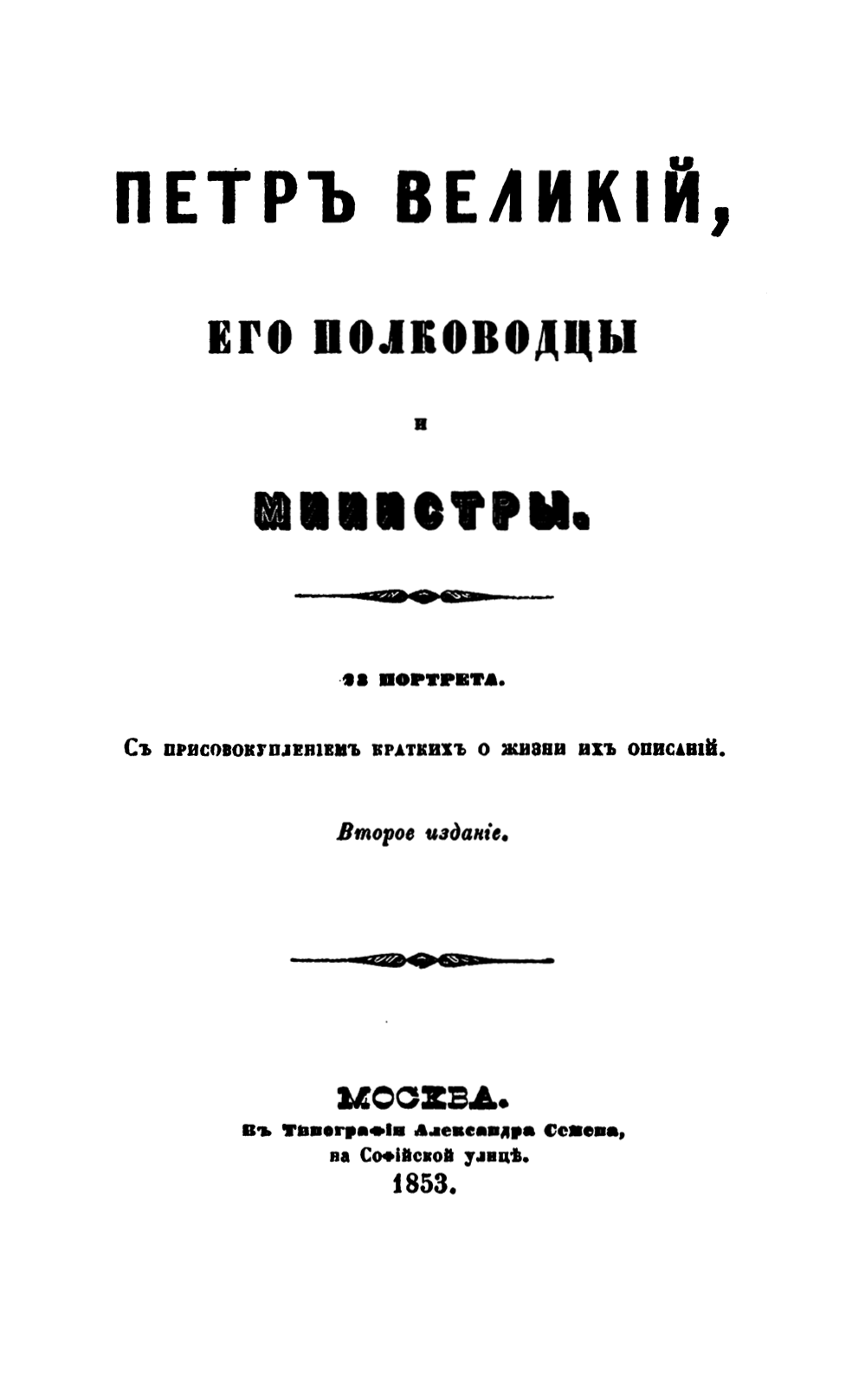 Оттиски гравированных на стали портретов сподвижников Петра I, сопровождаются их краткими биографиями, составитель которых не указан.