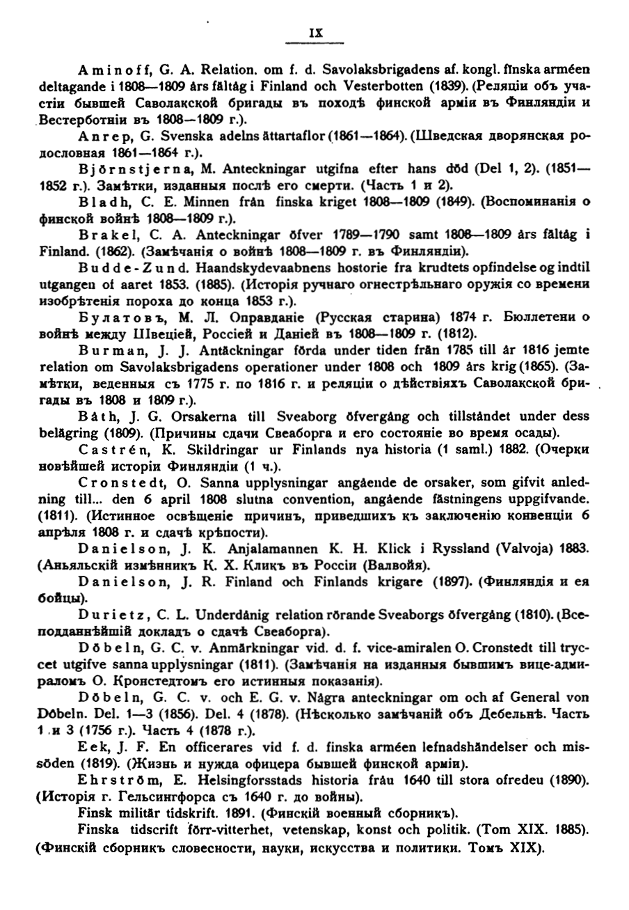 «Трудность шведского языка и малое его распространение вообще, а в России в частности, делало этот труд до сего времени недоступным для огромного большинства русских военных читателей и исследователей, между тем как война Швеции с Россией в 1808 – 1809 гг., приведшая к окончательному покорению и присоединению Финляндии к России, нашими историками мало исследована и разработана.