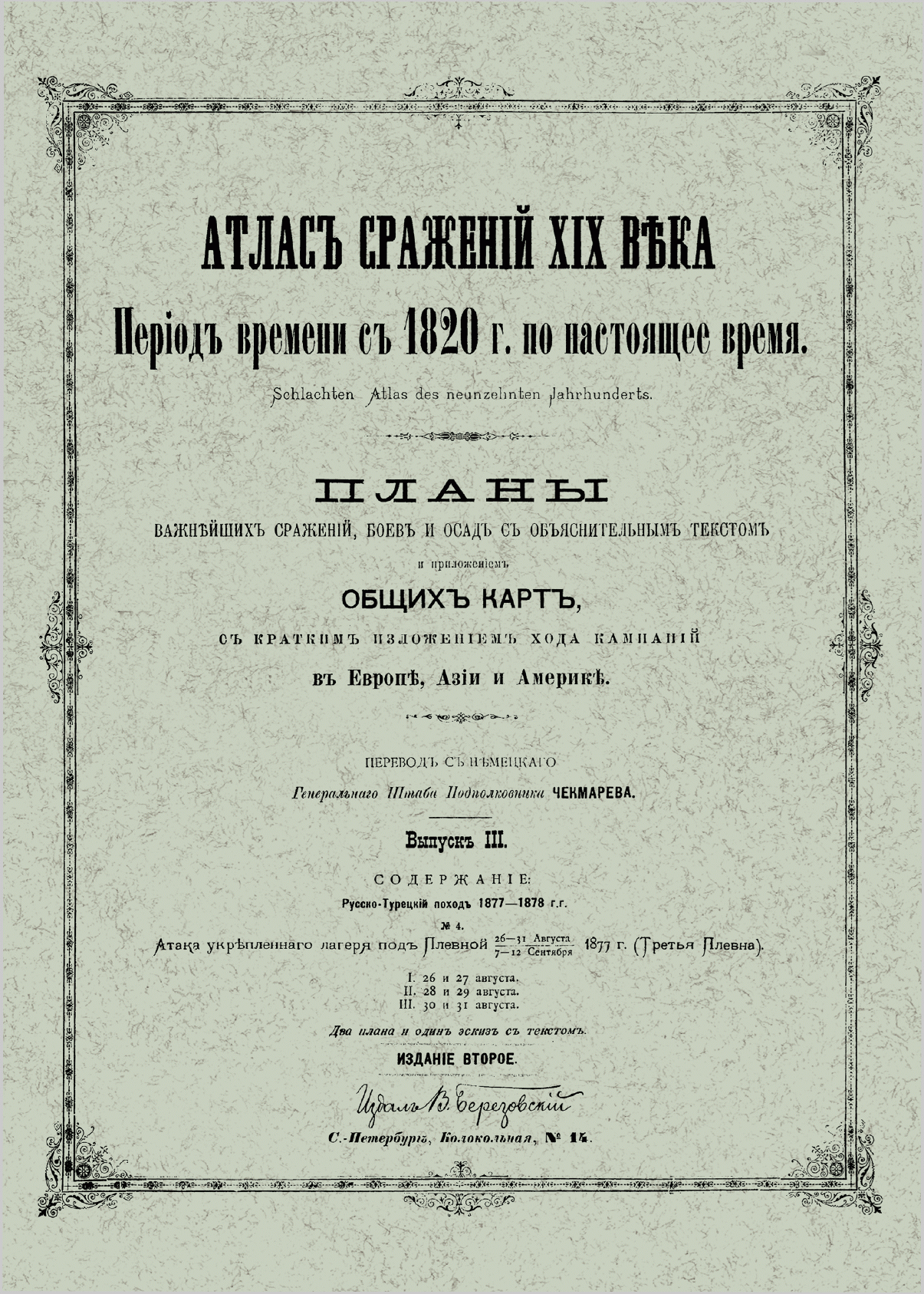 Второе издание «Атласа сражений XIX века» в 20-ти выпусках, представляет собой перевод на русский язык, выпускавшегося в военно-научном комитете Главного штаба на немецком языке с 1830-х гг., разрозненного собрания карт и планов военных кампаний армий мира в XIX века. Переводчиком данного издания является Виктор Иванович Чекмарев (1861–1939) — генерал-лейтенант (1912), видный военный деятель российской императорской армии, историк, участник Первой мировой войны и белого движения на юге России, впоследствии в эмиграции. С 1894 г., занимая должность делопроизводителя, а затем столоначальника канцелярии военно-ученого комитета Главного Штаба, подполковник Генерального Штаба Чекмарев, в результате кропотливой работы собрал воедино «Атлас сражений XIX века», каждый выпуск которого посвящен одной или нескольким военным кампаниям Европы, Азии и Америки, содержит подробное описание расположения войск и хода боевых действий противников, хронологию событий, снабжен картами и планами сражений. Это издание имеет большую историко-культурную ценность, интересно как ученым-историкам, так и любителям военно-исторической литературы.