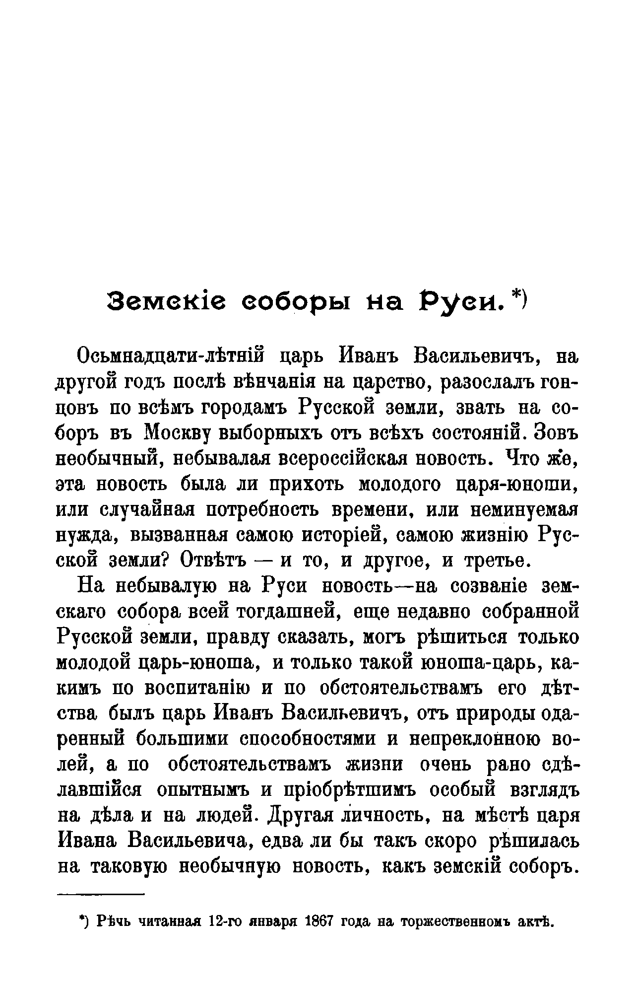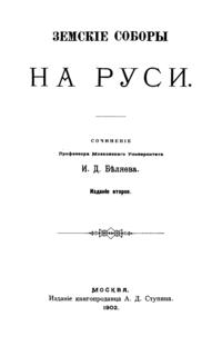 Профессор Императорского Московского университета Иван Дмитриевич Беляев, изучив историю Земских соборов, на которых рассматривались важнейшие государственные вопросы, делает вывод о том, что ни один собор на Руси не был созван не по воле царя. Но эта воля была не произволом той или иной царственной личности, а только «исторической формой» – история работала, закладывала семя, а жизнь это семя растила, и из него вырастал плод, который являлся неотложным поводом к созыву земского собора. Так, Петр Великий почти тридцать лет без устали работал над тем, чтобы Екатерина Великая через сорок лет после его кончины созвала земский собор в Москве. В то же время русская земля никогда не требовала земских соборов, а всегда считала только своей повинностью высылать своих представителей на собор, когда царь потребует этой повинности. Это, по мнению автора, завет наших предков потомкам, повторяемый более трёхсот лет.