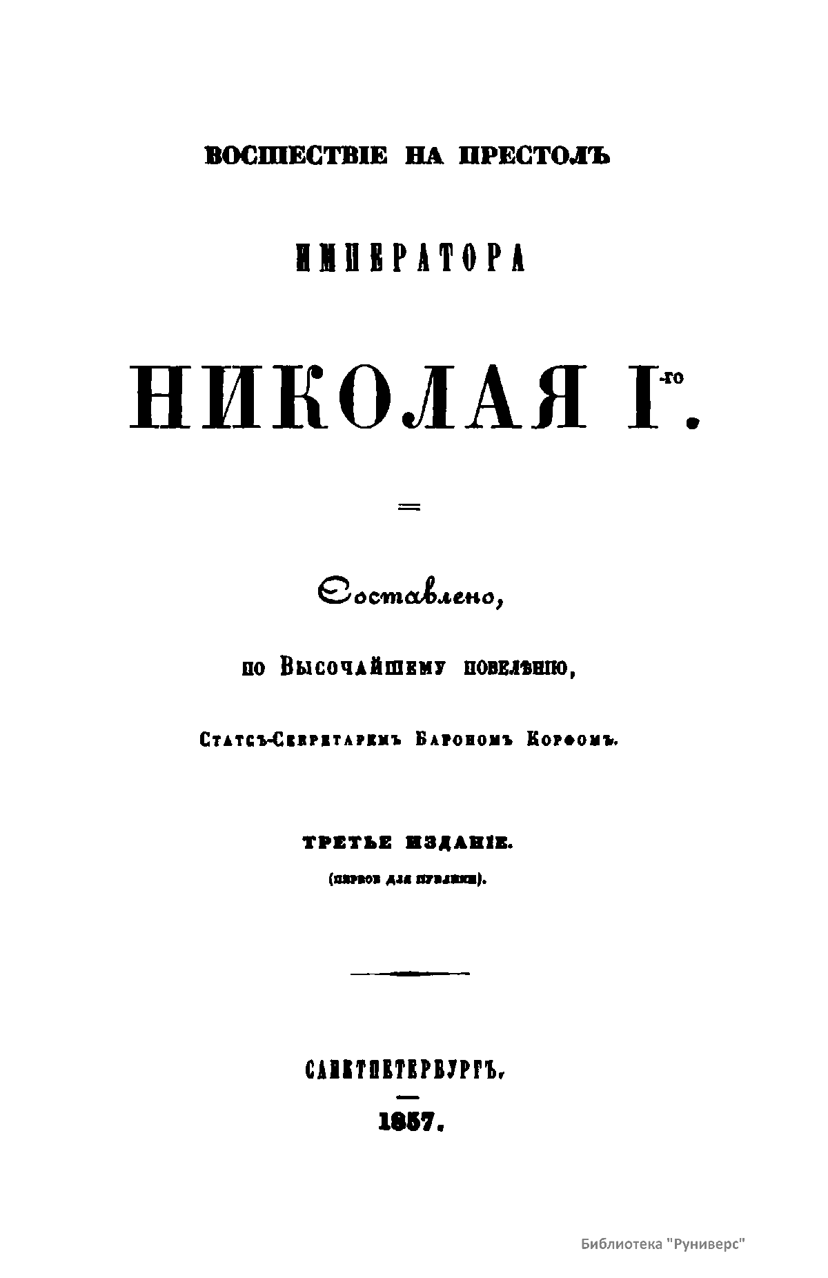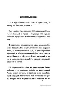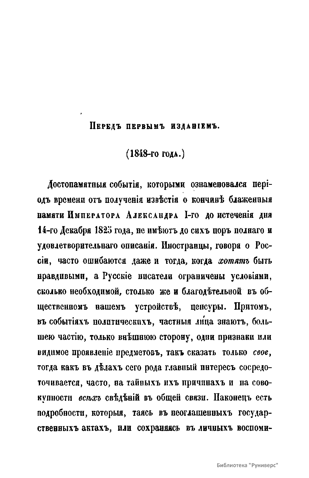 Николай I (1796 – 1855), российский император с 1825 г., третий сын Павла I. При составлении настоящего издания автор пользовался следующими источниками: I. Собственноручная подробная записка, написанная Николаем I для II. Воспоминания великого князя Михаила Павловича. III. Рассказы князя А.Н. Голицына и графа М.М. Сперанского. IV. Рассказы и частью письменные заметки живых свидетелей и деятелей 14 Царственного семейства. декабря: генерал-адъютантов графа Орлова, графа Левашова, графа Адлерберга, Перовского, Кавелина и Философова, генерала Ростовцева. воспоминания редактора. V. Рассказы некоторых других достоверных очевидцев и собственные VI. Бумаги князя В.П. Кочубея. VII. Подлинные акты Государственного совета. VIII. Акты Следственной комиссии и Верховного уголовного суда. IX. Официальные реляции 15 и 29 декабря 1825 г. X. Полное собрание законов.