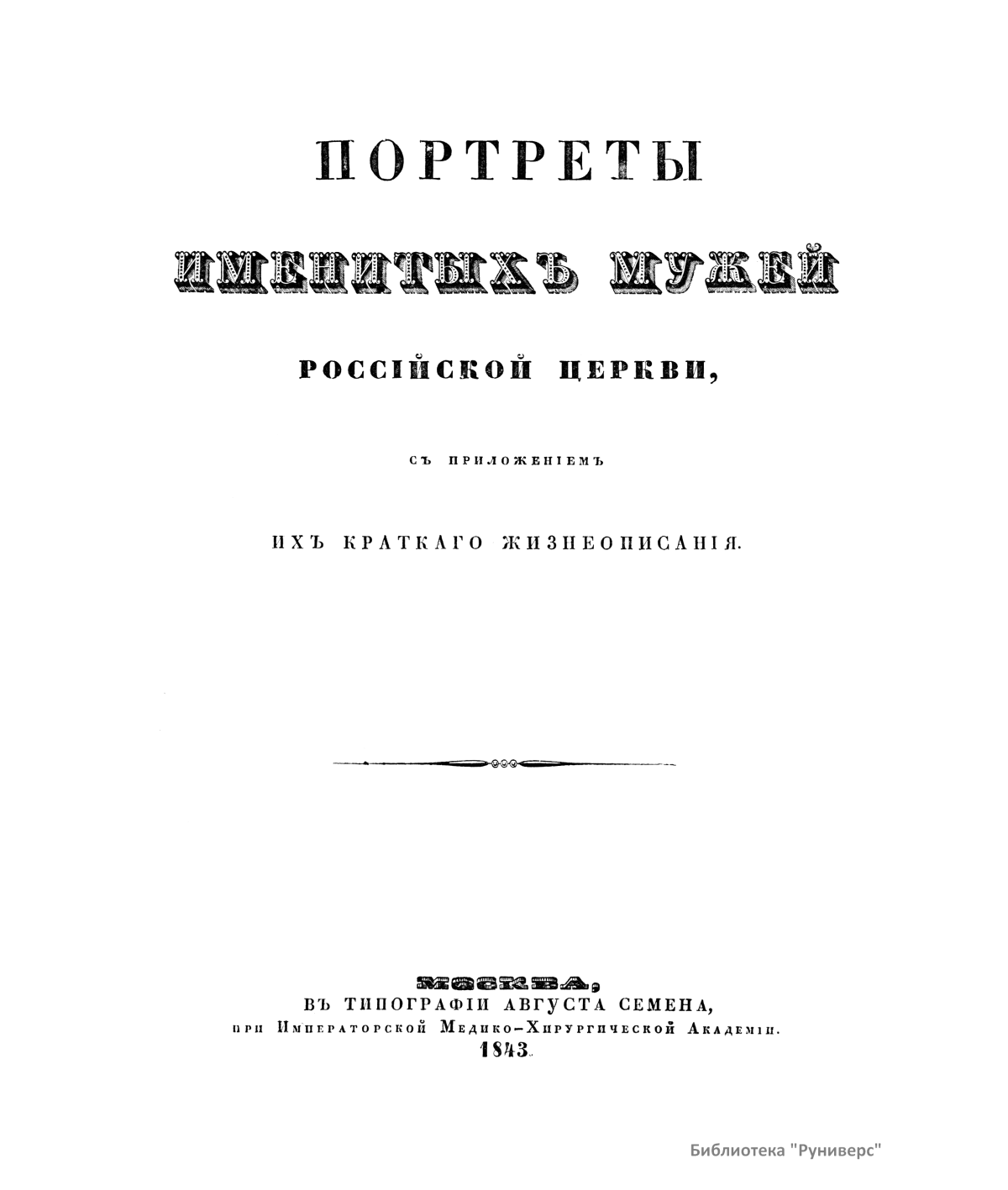 Портреты именитыхъ мужей россiйской церкви, съ приложенiемъ ихъ краткаго жизнеописанiя