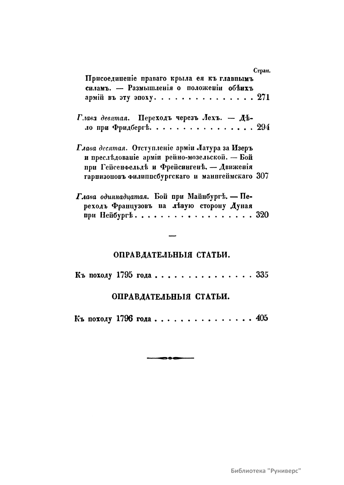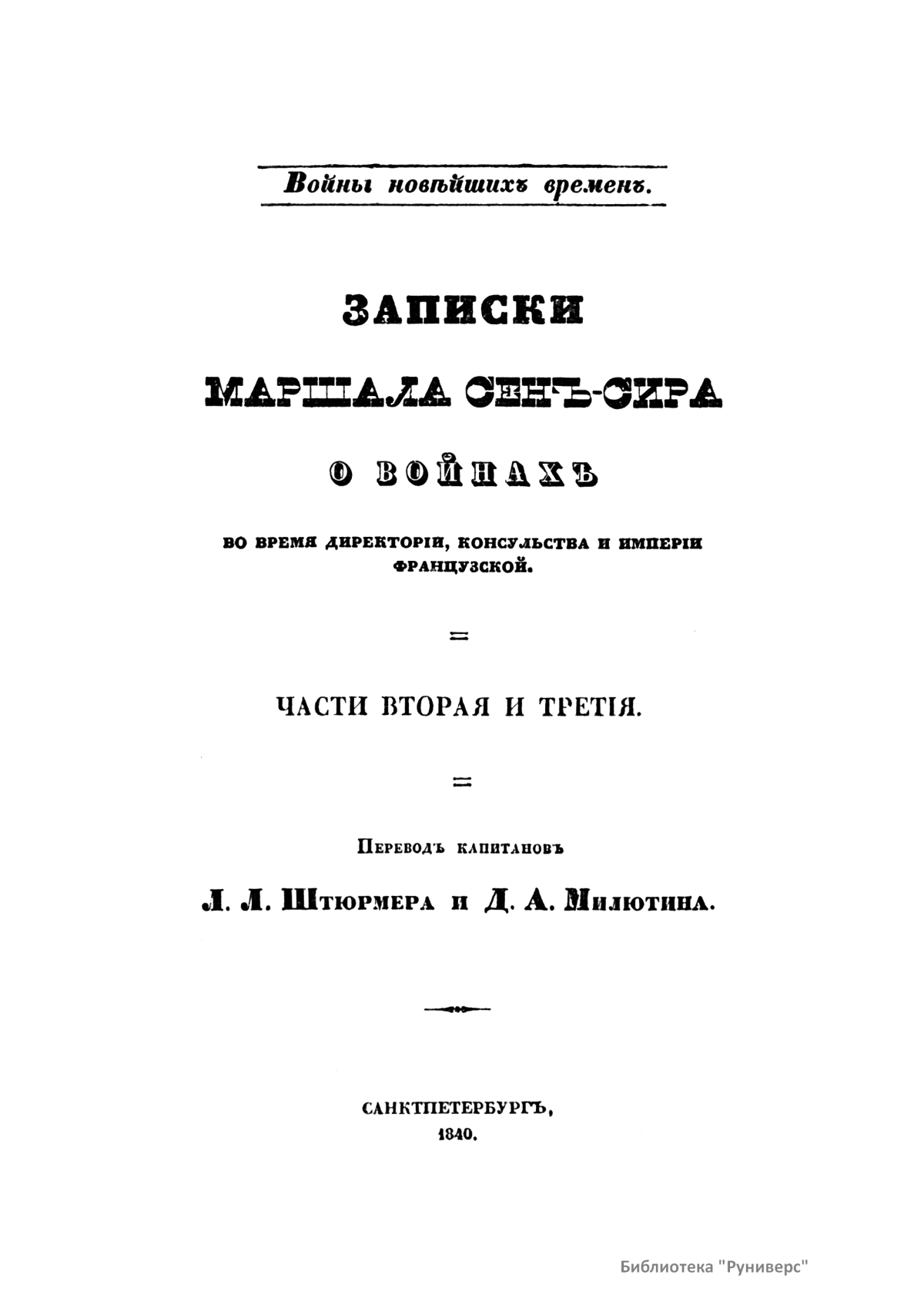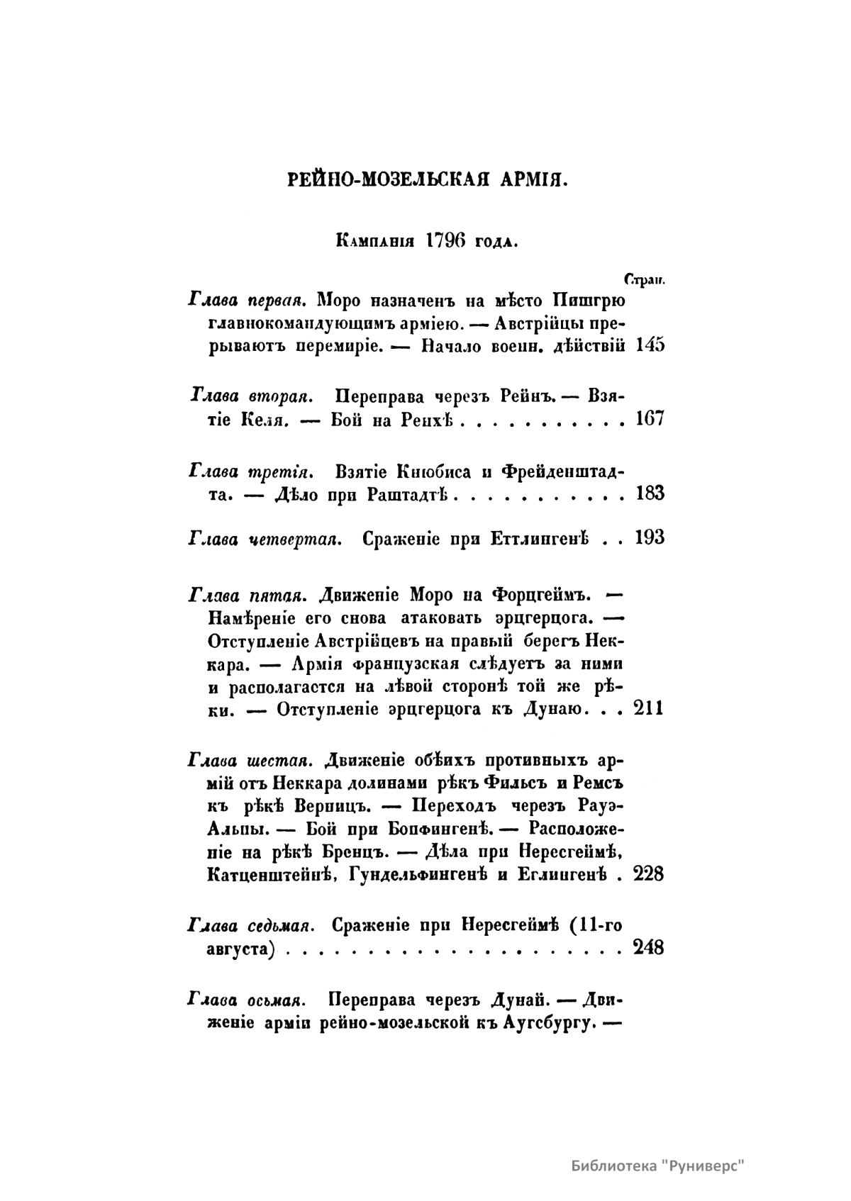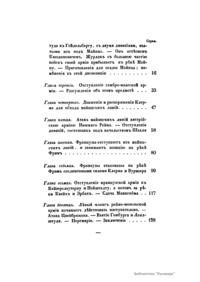 Первый том – Записки маршала Сен-Сира о войнах во времена директории, консульства и империи французской. Часть первая. Второй том – Сочинение Брандта. Обозрение истории военного искусства в средних веках. Третий том – История войн в Европе с 1792 г. вследствие перемены правления во Франции. Четвертый том – Сочинение Маккиавелли. Военное искусство. Пятый том – Записки маршала Сен-Сира о войнах во времена директории, консульства и империи французской. Части вторая и третья. Шестой том - Записки маршала Сен-Сира о войнах во времена директории, консульства и империи французской. Части третья (продолжение) и четвертая.