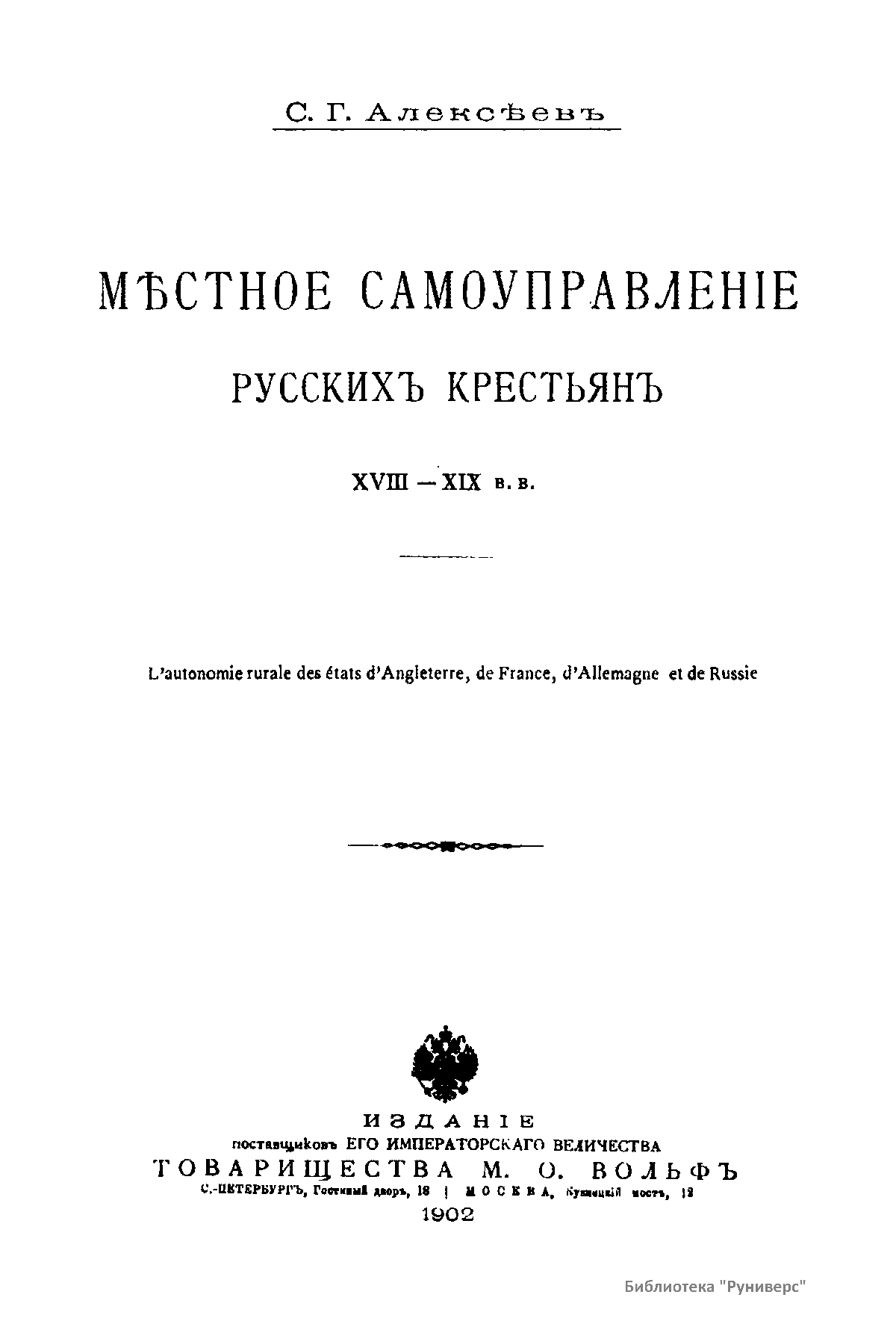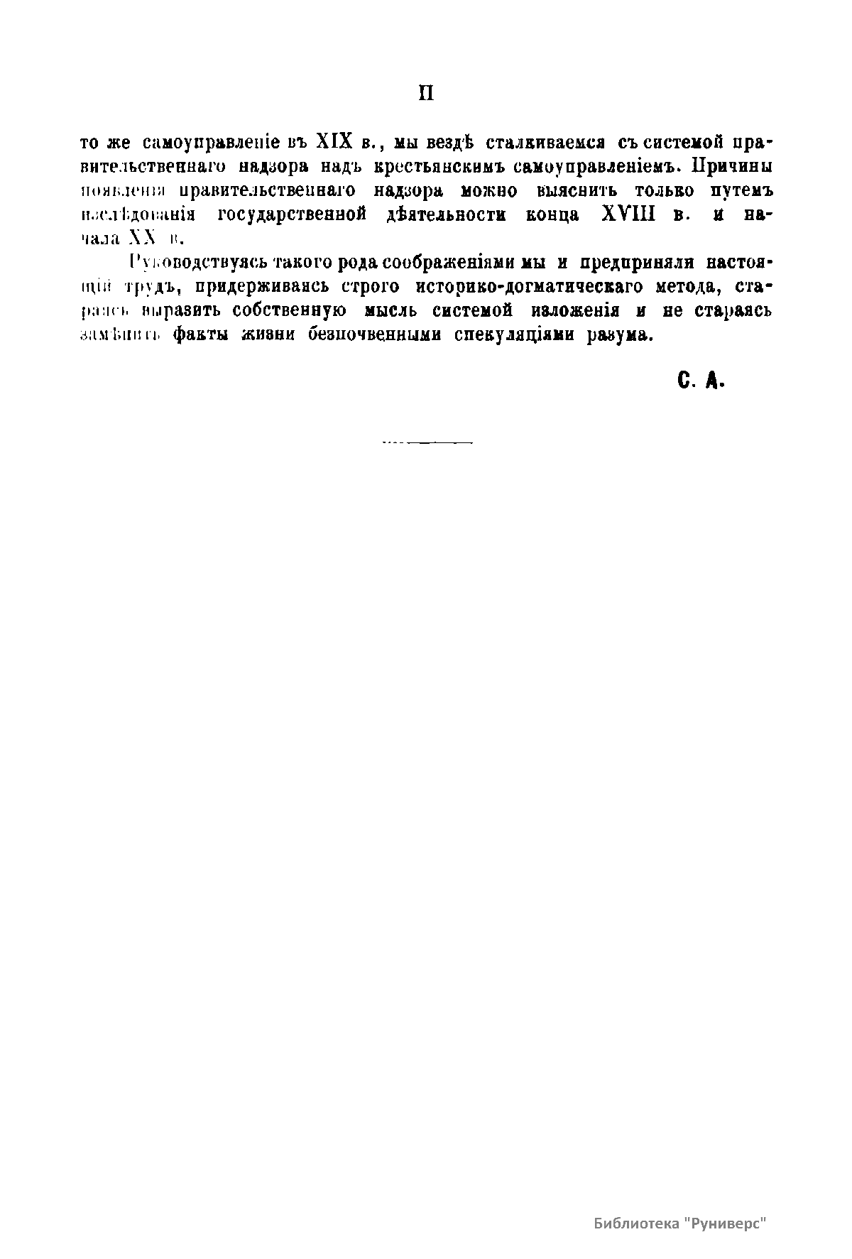 Исследование является сжатым конспектом тысячи томов законодательного и незаконодательного материала. В нем представлены результаты изучения хода развития самоуправления русских крестьян, а также исторический анализ законодательной деятельности и правительственной практики в отношении крестьянского самоуправления за границей и в России. Анализ ограничен двумя веками: восемнадцатым и девятнадцатым, так как именно в это время проявились две противоположные государственные системы в отношении крестьянского самоуправления. В восемнадцатом веке, в отличие от девятнадцатого, отсутствует система правительственного надзора над самоуправлением крестьян.
