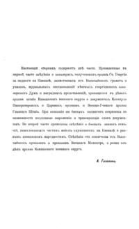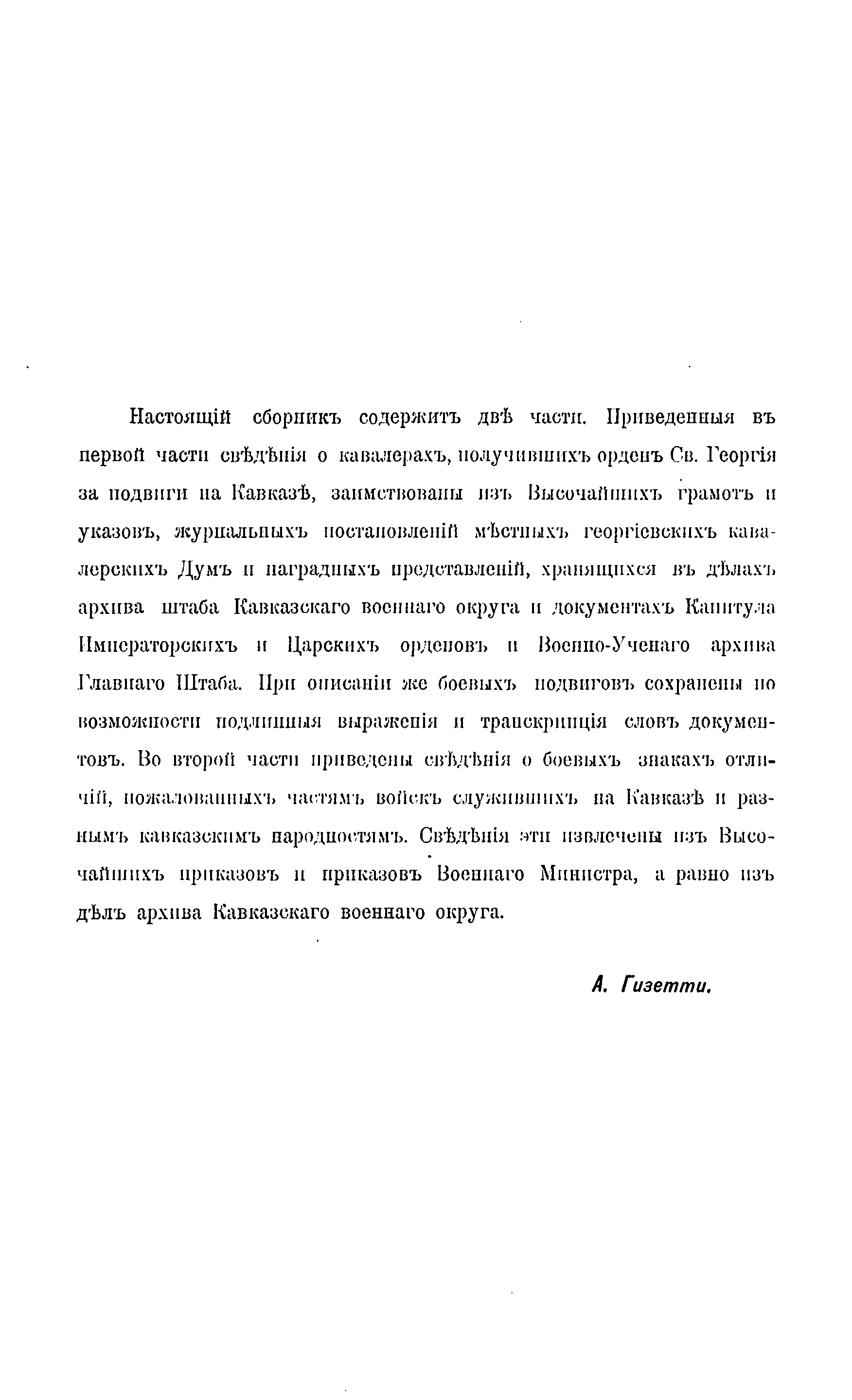 Представленное издание является органичной составной частью многолетней программы изучения боевых действий, устройства, организации и развития регулярных войск российской императорской армии на Кавказе, проводившейся военно-историческим отделом при штабе Кавказского военного округа. Ряд исследований на эту тему уже были помещены на нашем сайте. Настоящее исследование известного историка войн России на Кавказе генерал-майора в отставке А.Л. Гизетти, который в течение длительного времени занимался изучением этой темы, разделено автором на две части. Приведенные в первой части сведения о кавалерах, получивших орден Святого Георгия за воинские заслуги во время боевых действий на Кавказе, были собраны из указов Императора, постановлений георгиевских дум, журналов боевых действий, наградных представлений, находившихся среди документов архива штаба Кавказского военного округа и Военно-Ученого архива Генерального Штаба. Во второй части труда приведены данные о боевых знаках отличия, пожалованных частям российских войск, проходивших службу на Кавказе, а также вооруженным формированиям, созданным из представителей разных народов Кавказа. В книге приводятся данные о награждениях российских воинов и полководцев орденом Святого Георгия за успехи в боевой деятельности на Кавказе с момента учреждения этой высшей военной награды в 1774 г. вплоть до 1880-х гг. За более чем столетний период награждений всего было пожаловано этим высшим военным орденом 536 человек. Среди них первой и второй степенью ордена были удостоены главнокомандующие российскими войсками на Кавказе генерал-фельдмаршалы граф И.Ф. Паскевич-Эриванский и великий князь Михаил Николаевич.