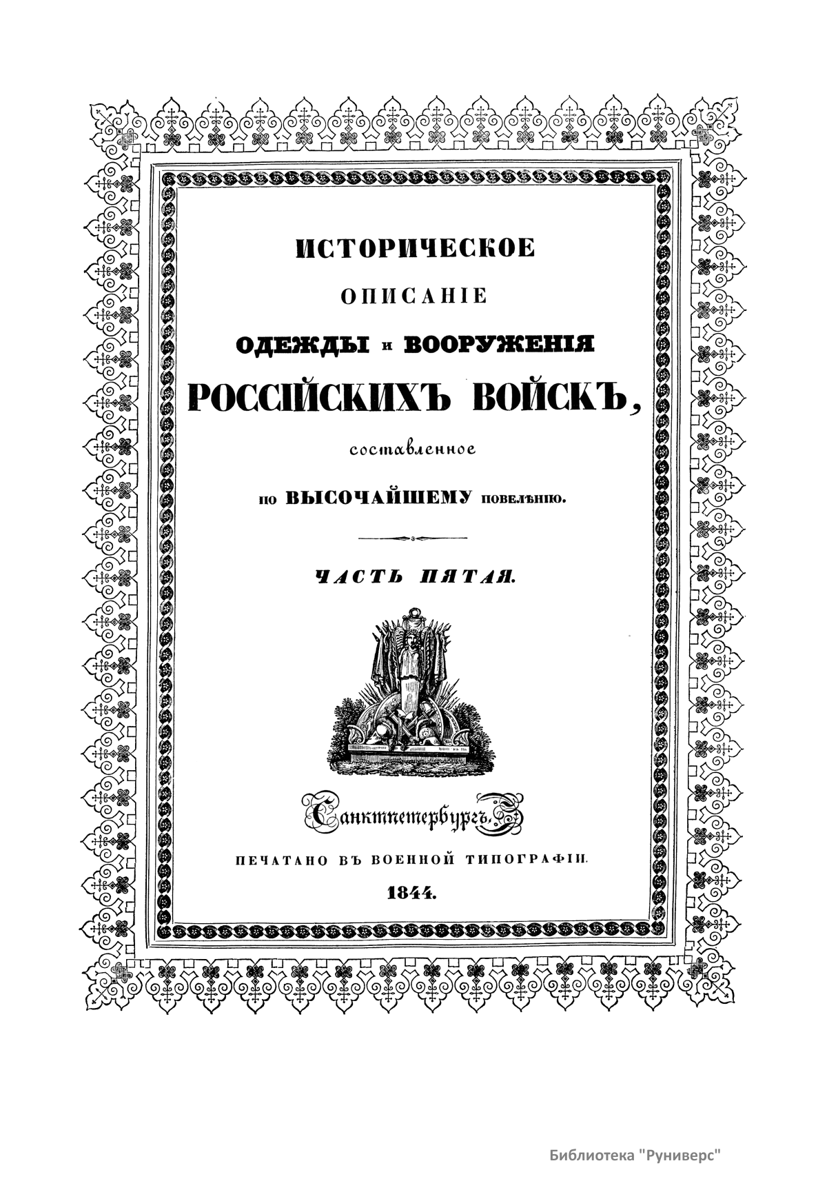 Многотомный труд «Историческое описание одежды и вооружения Российских войск, с рисунками, был составлен по высочайшему повелению» выходил в Санкт-Петербурге в