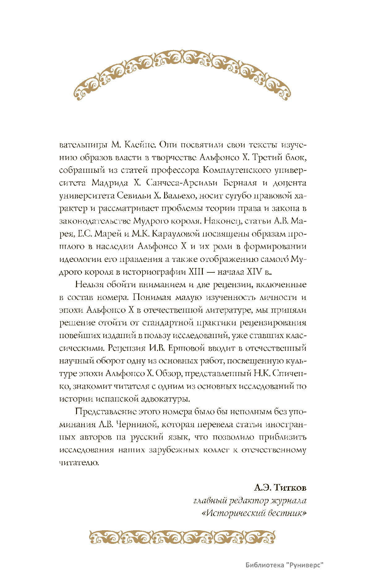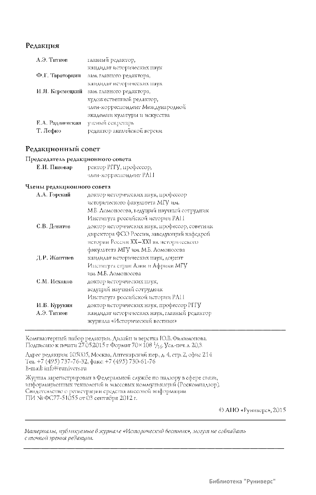 Дорогие коллеги, мы представляем вам первый номер «Исторического вестника», который одновременно обозначается 148-м томом, тем самым продолжая дореволюционное издание. Однако, перешагивая почти сто лет, мы понимаем, что реалии XXI века определяют и новое содержание журнала. История сегодня во многом актуализирована политикой. Именно геополитическая ситуация в мире, возвращающая нас к вопросам сохранения существующих границ, национальных и культурных ценностей, моральных и религиозных принципов, формирует еще одно измерение — проблему аутентичного исторического бытования народов и государств. С одной стороны, это вопрос географических ареалов государственных образований, с другой — тема, связанная с соприкосновением, взаимодействием процессов, культур и традиций. Во многом мы стоим и перед важнейшей этической проблемой. Мы должны не только вежливо и настойчиво указывать нашим уважаемым соседям на свои исторические права, но и сами уходить от искушения искусственного удревнения собственной истории или присвоения чужой. И здесь на сцену выходит его величество Исторический Научный Факт. Он и есть главный цензор и законодатель. На этом незыблемом основании будет строиться редакционная и научная работа «Исторического вестника».