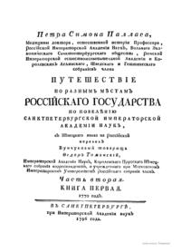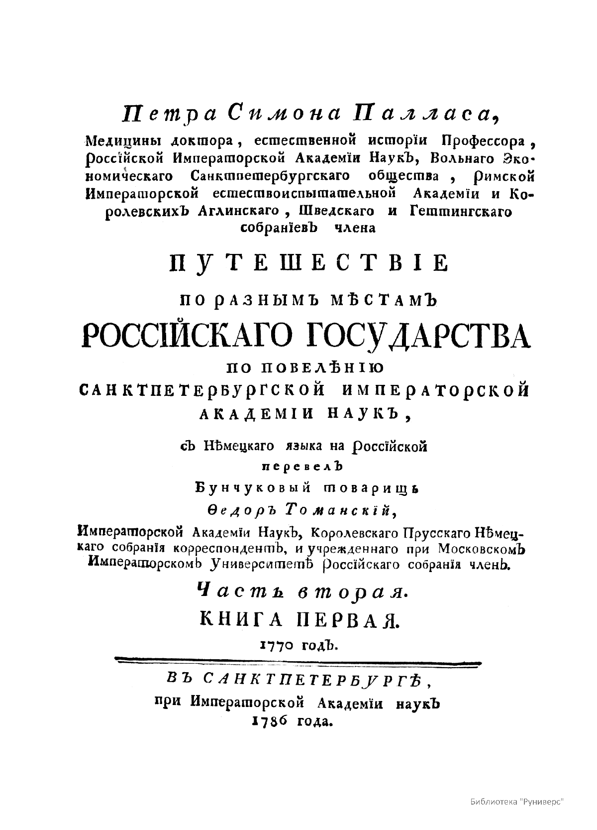Научные труды П.С. Палласа выходили сначала на родном ему, немецком языке, а потом переводились на русский. Перевод с немецкого труда «Путешествие по разным местам Российского государства» в трех частях (пяти книгах) был выполнен Ф. Туманским и учеником Палласа, Василием Зуевым, состоявшим в его экспедиционном отряде. Впервые на русском языке «Путешествие…» было издано в 1773–1788 гг. в серии «Собрания, старающегося о переводе иностранных книг», учрежденной Екатериной II.