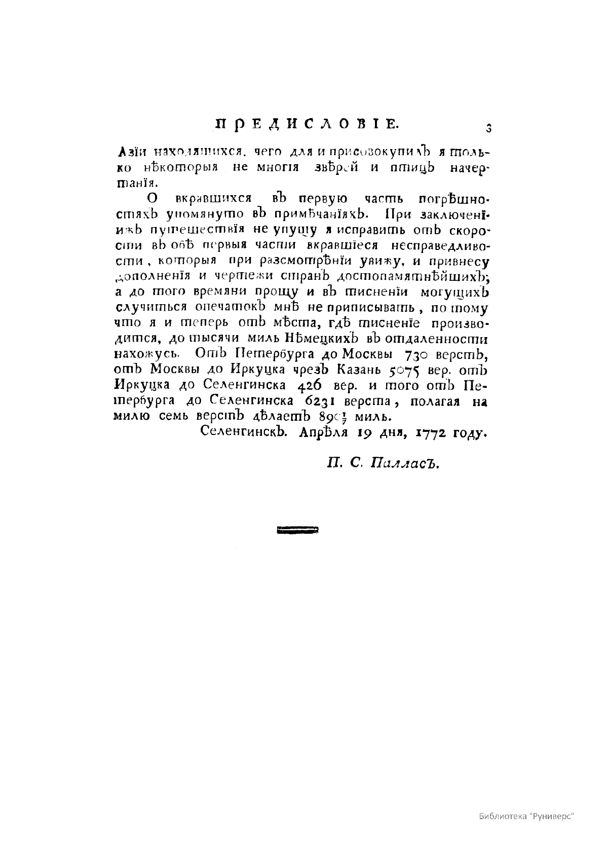 Петр Симон Паллас (1741–1811) – один из крупнейших естествоиспытателей XVIII века. Талантливый берлинский ученый в 1767 г. принял приглашение поступить на службу в Петербургскую Академию наук. Вскоре он начал подготовку к задуманной Академией наук комплексной экспедиции для исследования России в естественноисторическом, экономическом и культурном отношении. Палласу было поручено руководство одним из отрядов Оренбургской экспедиции. В 1768–1774 гг., в течение шести лет отряд Палласа провел выдающиеся исследования европейской части России, Урала и Сибири. На протяжении всего путешествия ученый вел подробный путевой журнал. Огромный фактический материал, собранный Палласом, лег в основу его главного труда – «Путешествие по разным местам Российского государства», который оставался настольной книгой многих поколений ученых. В предисловии к своему труду Паллас говорит о достоверности, как главном свойстве описания путешествий. П.С. Паллас сумел значительно поднять уровень знаний в различных областях науки: зоологии и палеонтологии, ботанике, географии, геологии, этнографии, языковедении, истории, административного и территориального управления в России.