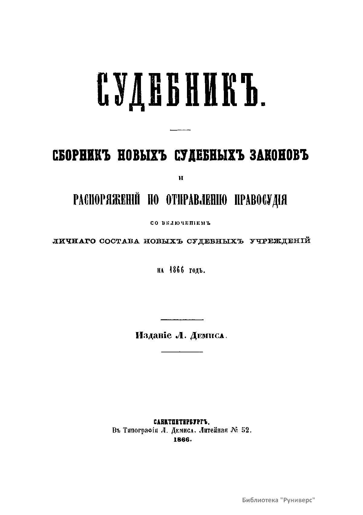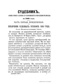 Судебникъ. Сборникъ новыхъ судебныхъ законовъ и распоряженiй по отправлению правосудiя со включенiемъ личнаго состава новыхъ судебныхъ учрежденiй на 1866 годъ