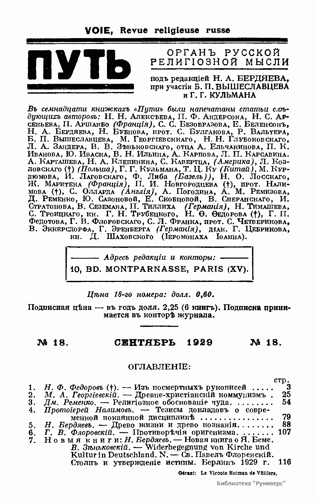 Путь: Орган русской религиозной мысли. №18. Сентябрь 1929