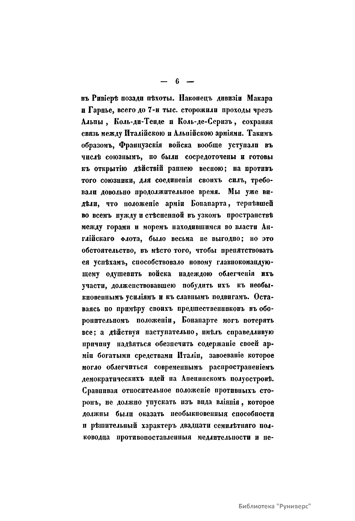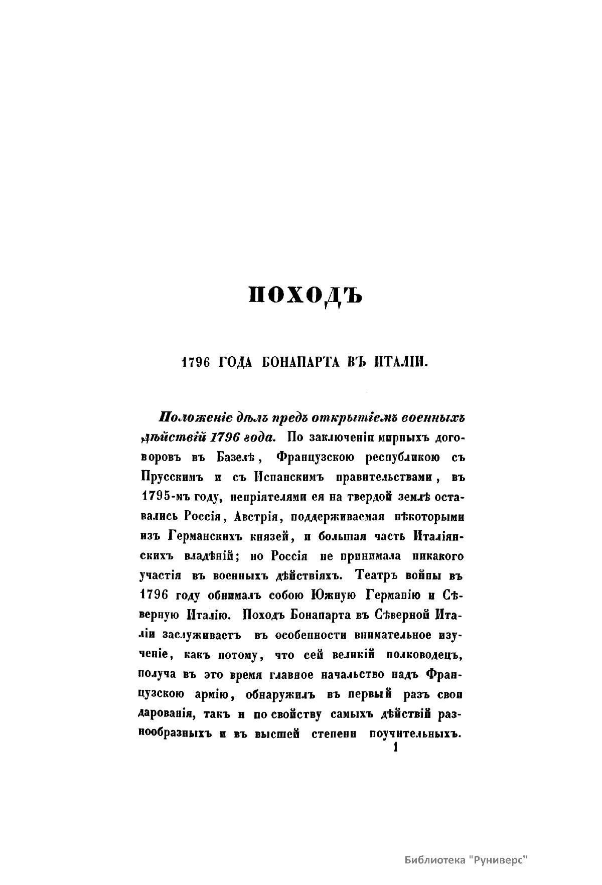 Подвиги великого полководца Бонапарта были увековечены в книгах и полотнах, его воззвания общепризнанны за образцы высокого военного красноречия. «Поход 1796 года Бонапарта в Италии» — первое сочинение подполковника, профессора Императорской военной академии М. И. Богдановича. Книга выпущена в 1845 г. в Санкт-Петербурге. Труд представляет собой критический обзор боевых действий в Италии во время войны 1796–1797 гг. Франции с первой коалицией европейских держав (Австрия, Великобритания, Россия, Сардиния, Королевство обеих Сицилий и др.). Он составлен на основе произведений известнейших военных писателей Г. В. Жомини, К. Клаузевица, мемуаров Наполеона и др. Здесь рассмотрена талантливая стратегия и тактика генерала Наполеона Бонапарта, под командованием которого французские войска выигрывали сражения с превосходящими силами австро-сардинских войск. К историческому описанию военных действий приложены пять карт и планов местностей, напечатанные на одном складном листе, и отдельно — «Карта Северной Италии». Повествование дополнено кратким очерком похода 1797 г. до заключения перемирия в Леобене.