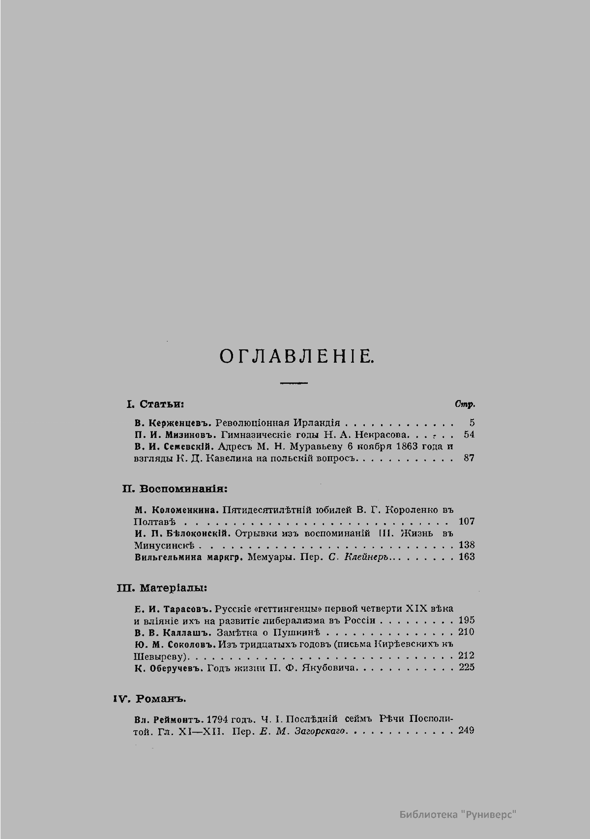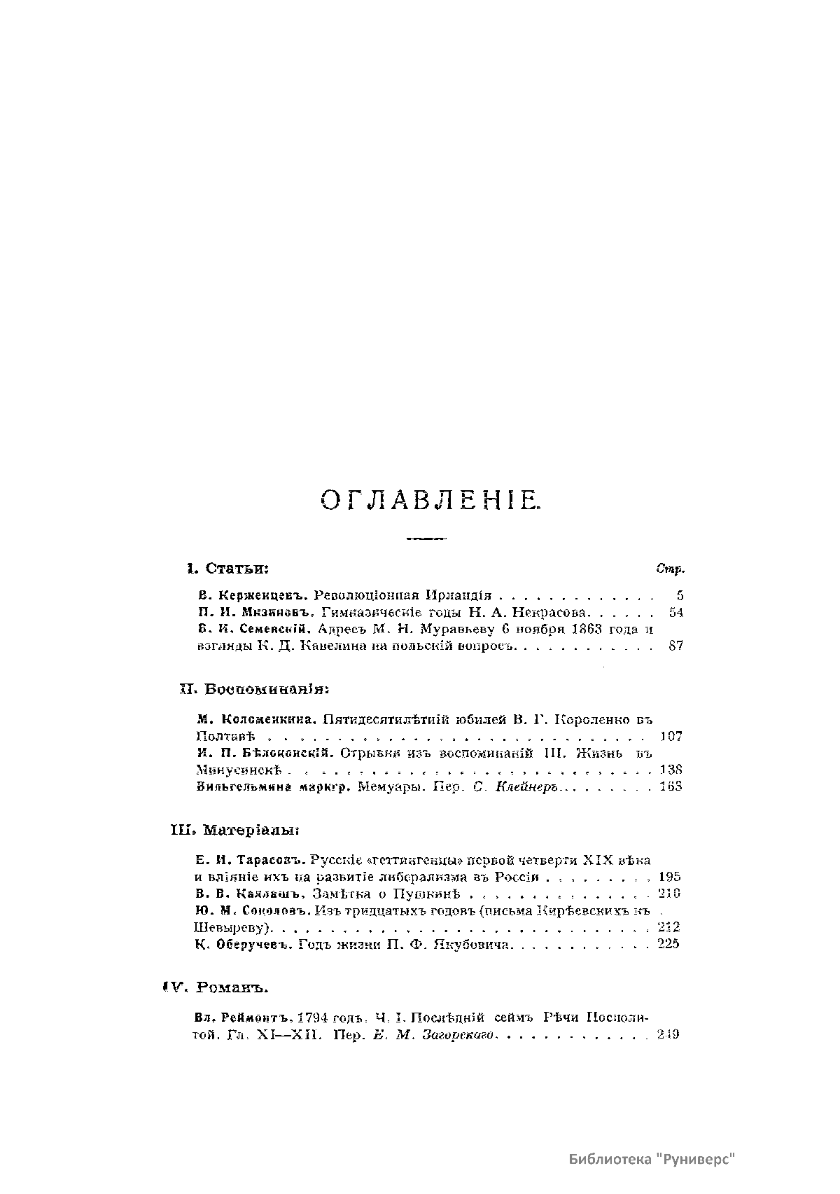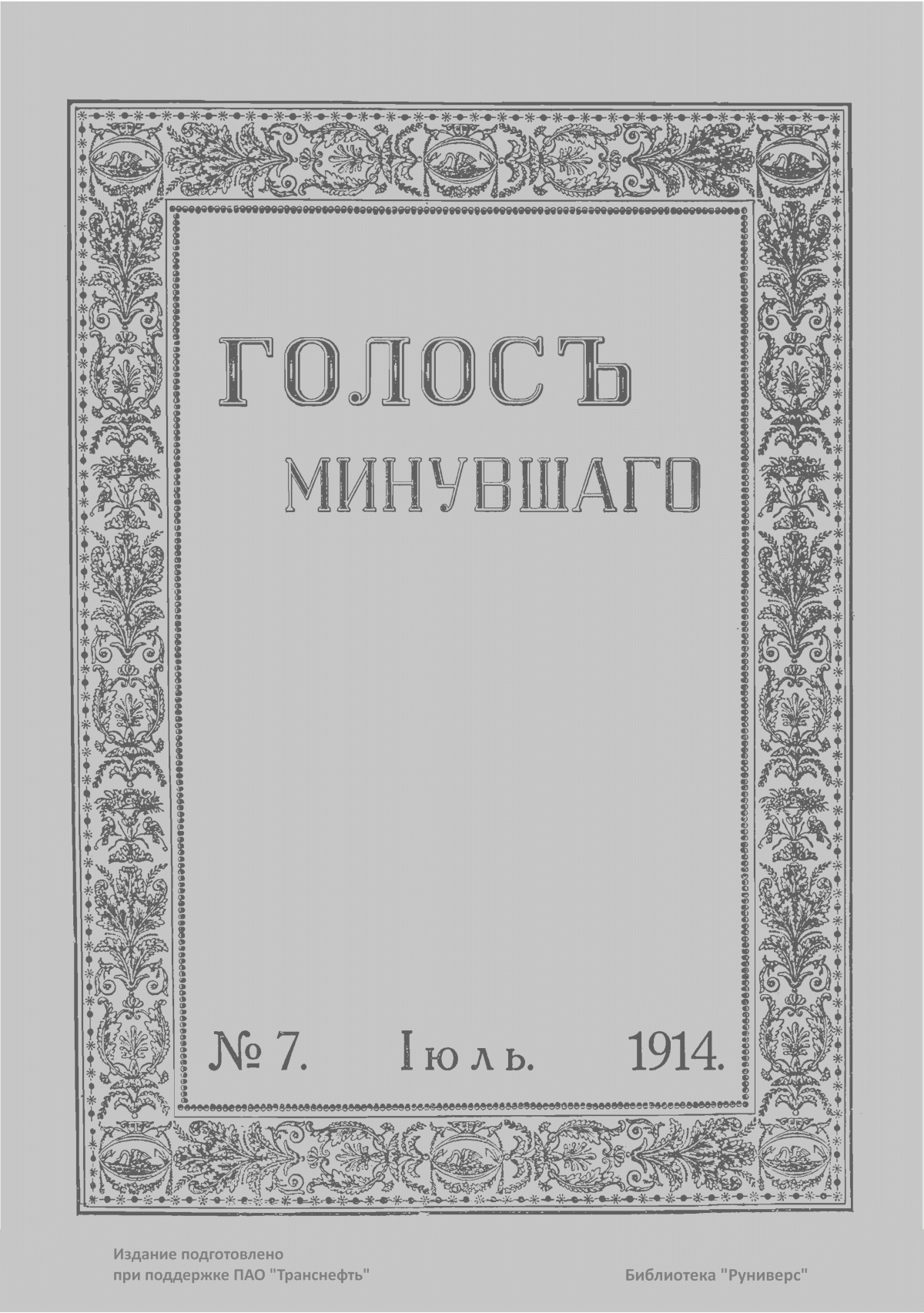 «Голос Минувшего» — журнал истории и истории литературы либерально-народнического направления, издававшийся в Москве с 1913 по 1923 год. Издателем журнала в 1913–1922 годах были известные русские историки, публицисты и общественные деятели С. П. Мельгунов (1880–1956) и В. И. Семевский (1848–1916). В редакционную коллегию также входили А. К. Дживелегов и П. Н. Сакулин. До 1919 «Голос минувшего» выходил ежемесячно, затем нерегулярно, всего было выпущено 65 номеров. В журнале публиковались интереснейшие материалы, посвященные истории литературы и общественных движений в России второй половины XVIII – начала XX веков. Здесь можно найти: статьи по вопросам русской и всеобщей истории, истории литературы, философии, искусства и археологии. В издании представлены: историческая беллетристика, биографии русских и иностранных деятелей, критика и библиография, новости русской и иностранной науки, обзор журналов русских и иностранных, хроника, мемуары, записки, дневники и письма декабристов, видных народовольцев и эсеров, крупных общественных деятелей и царских администраторов, писателей, военачальников и др. Среди авторов: Е. В. Тарле, А. Ф. Кони, А. К. Дживелегов, А. А. Кизеветтер, В. Г. Короленко и др. Стремление сделать журнал интересным для более широкого круга читателей способствовало тому, что в «Голосе Минувшего», хоть и в ограниченном количестве, печатались статьи по истории искусства и помещались иллюстрации: портреты, картины и рисунки, не знакомые или мало знакомые публике. В журнале опубликован целый ряд интересных писем, документов и воспоминаний. Абсолютное большинство текстов никогда не переиздавалось. Журнал снабжен указателями имен за 1913–1922 годы и систематическим указателем содержания.